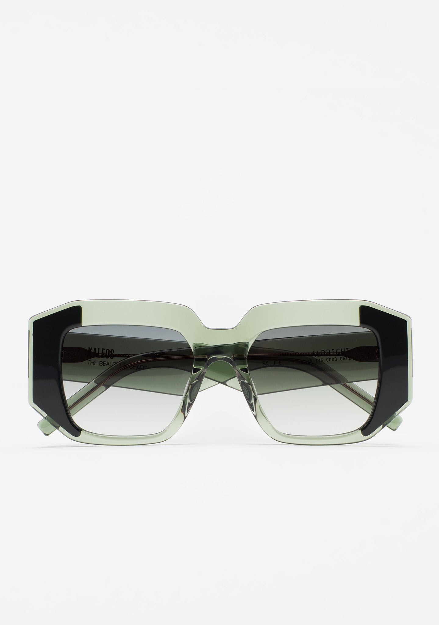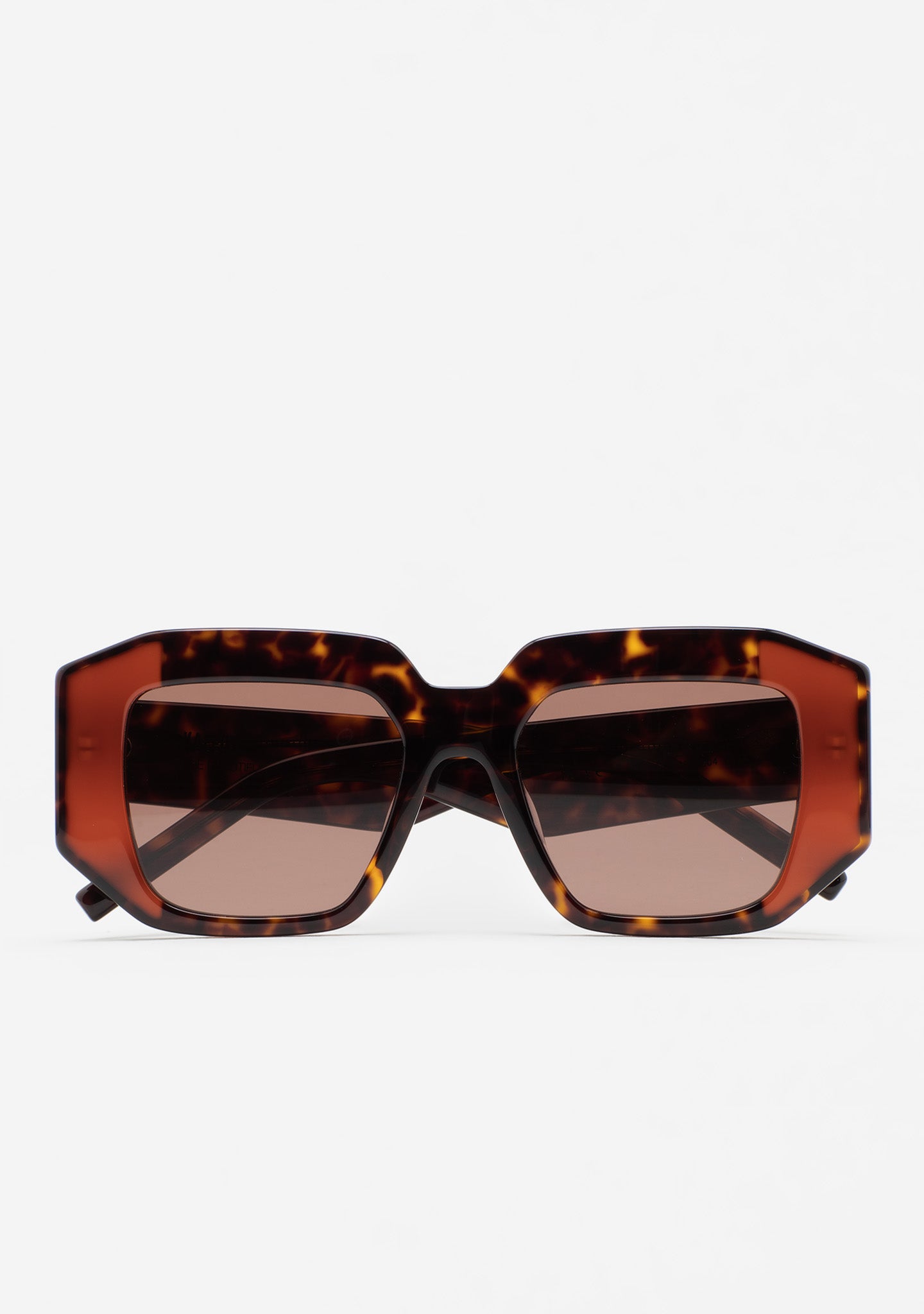 Rectangular sunglasses. Translucent acetate front with a translucent laminate. Acetate temples. Base 2 lenses with 100% UV protection and anti-reflective coating. Category 3 lenses. Built-in acetate pads. Handmade.