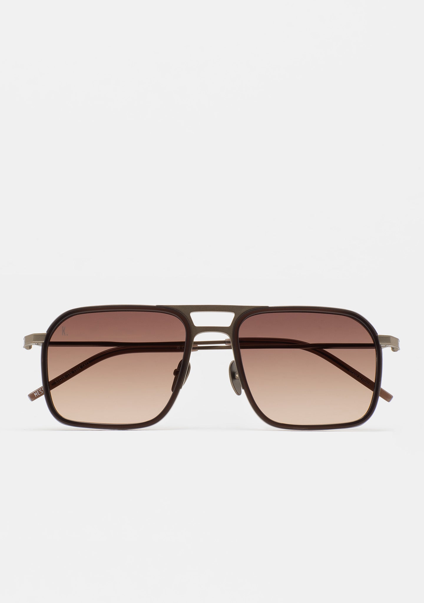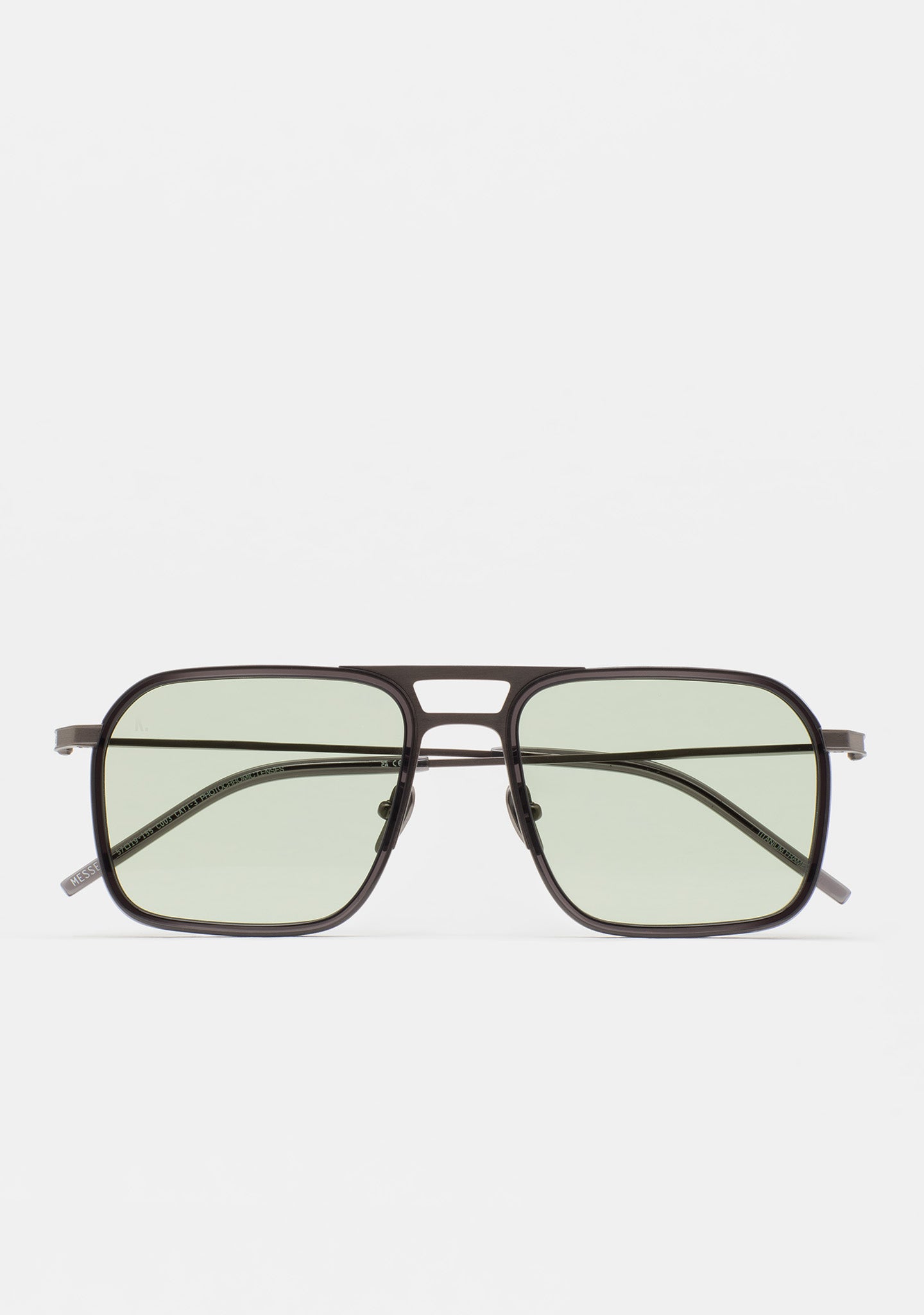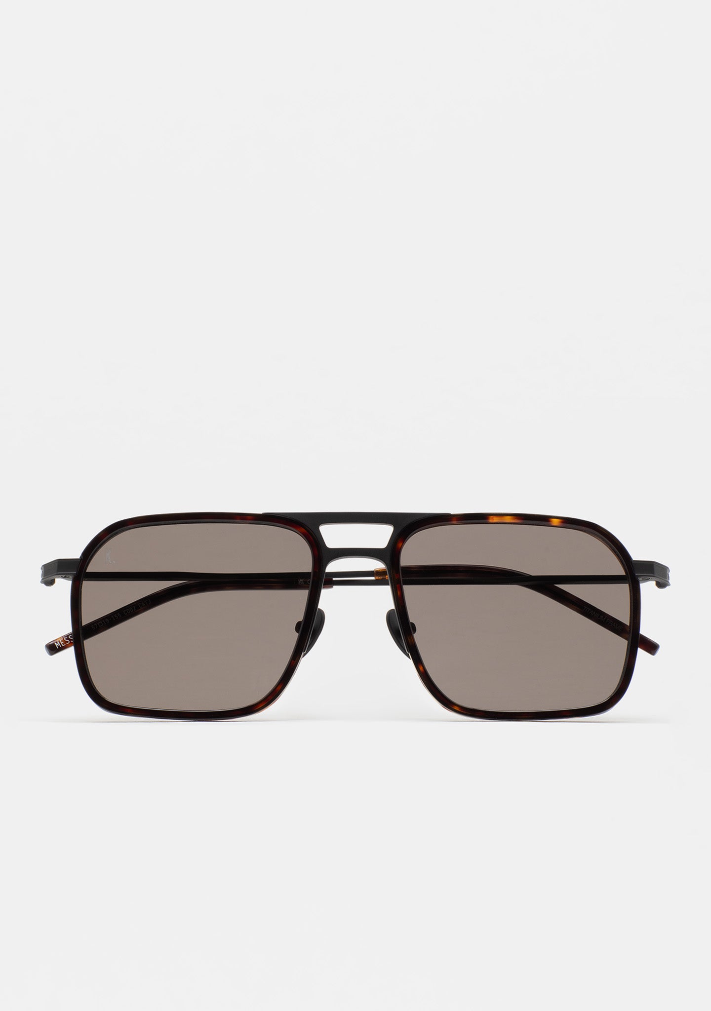 Square-shaped sunglasses with a double bridge. Titanium front with a high-density acetate frame. Titanium temples and bridge. Temples with acetate tips. Base 2 lenses with 100% UV protection and anti-reflective treatment. Category 3 lenses. Built-in acetate pads. Handmade.