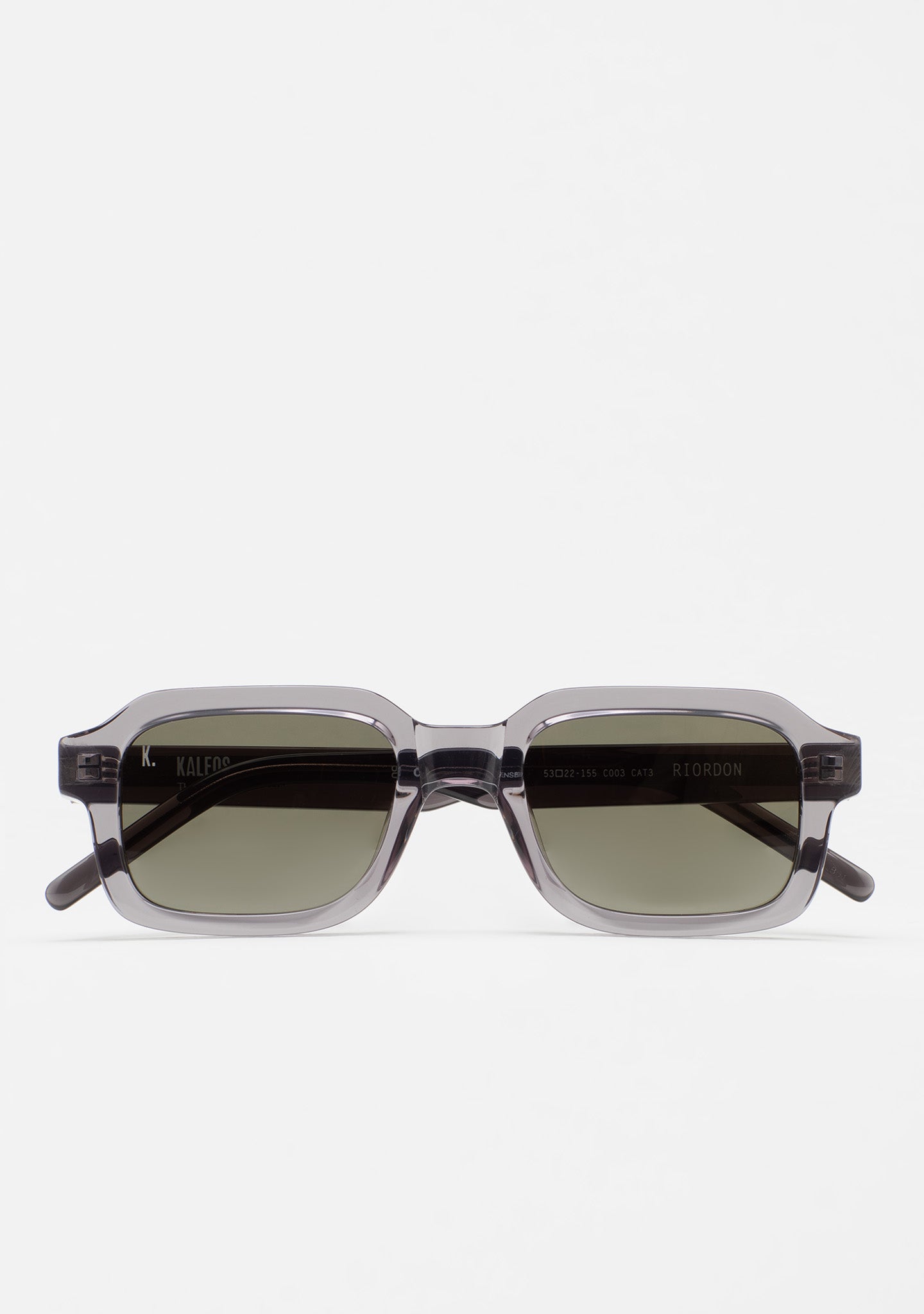 Gafa de sol de forma rectangular. Frontal y varillas de acetato. Lente base 2 con protección UV y tratamiento antirreflejante. Lente Categoría. Plaquetas de acetato incorporadas. Hecha a mano.