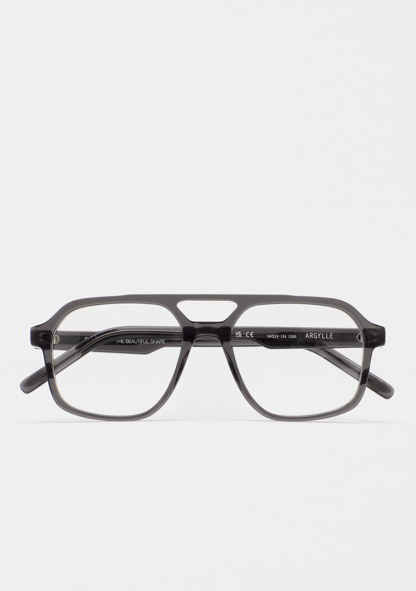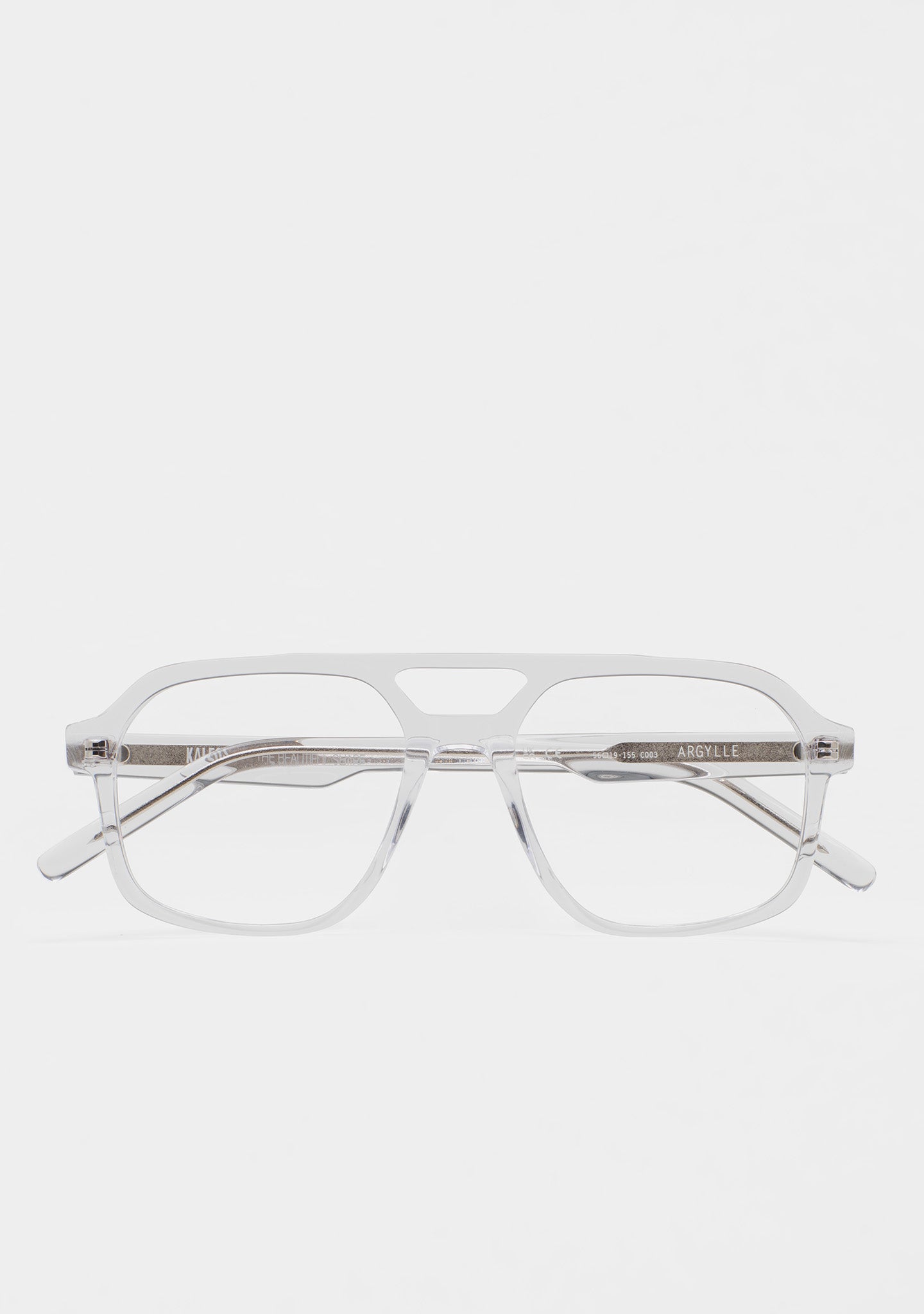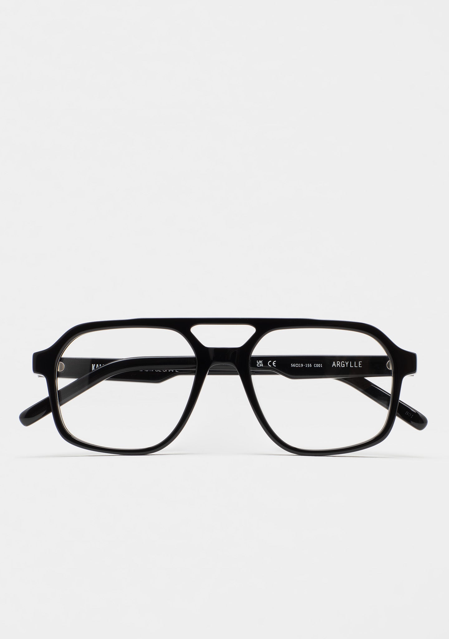 Gafa de ver de forma cuadrada con doble puente. Frontal y varillas de acetato. Plaquetas de acetato incorporadas. Hecha a mano.