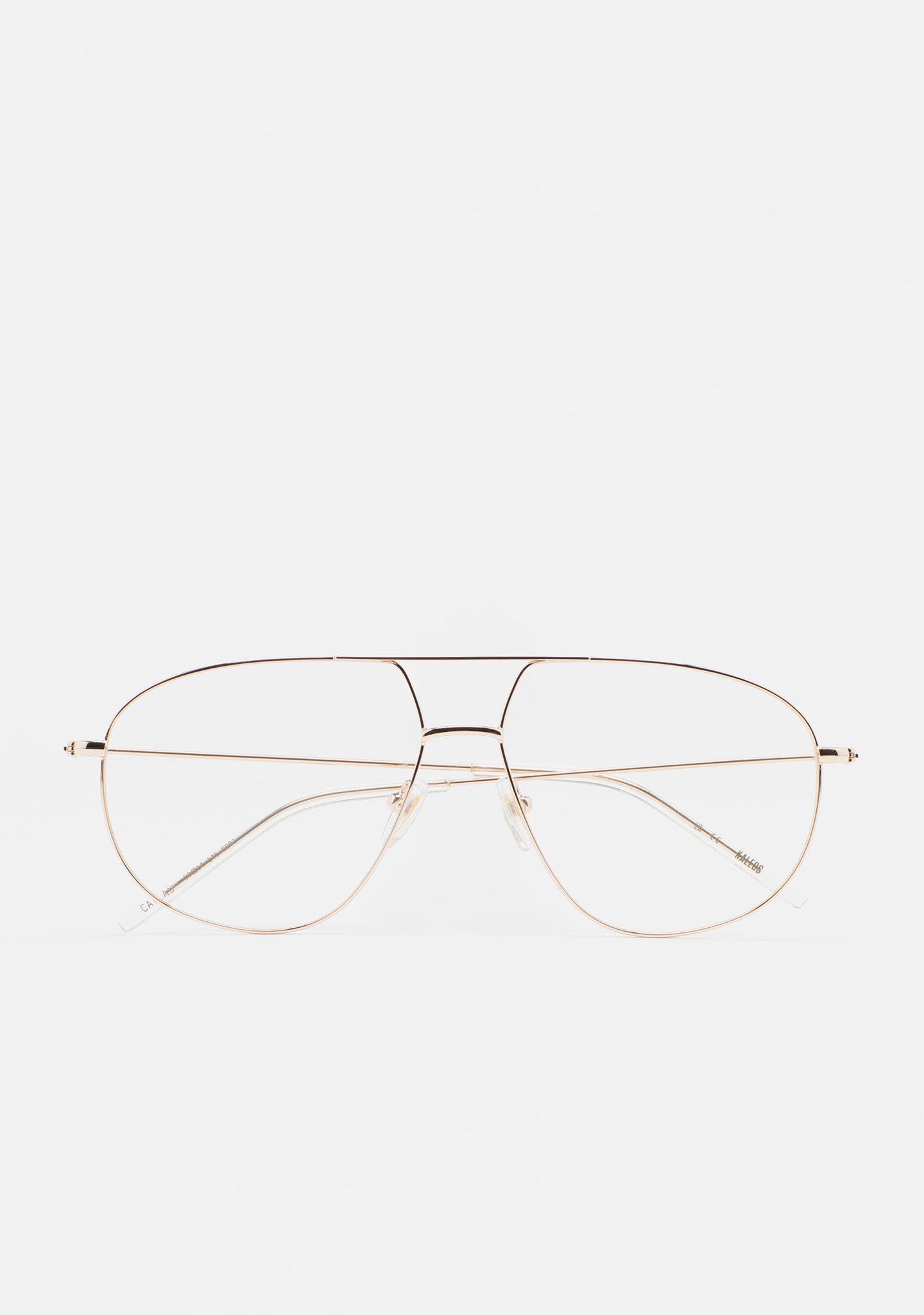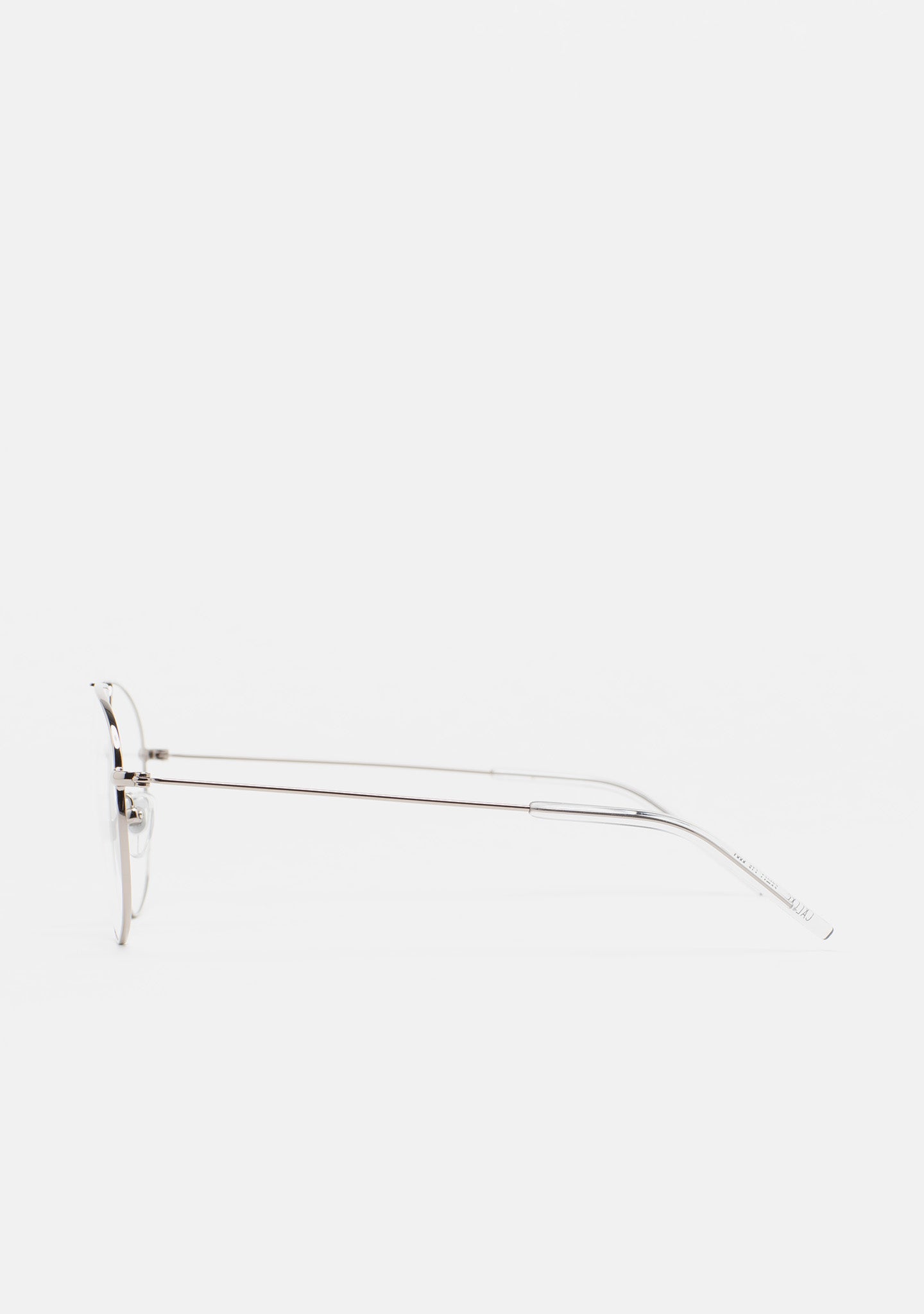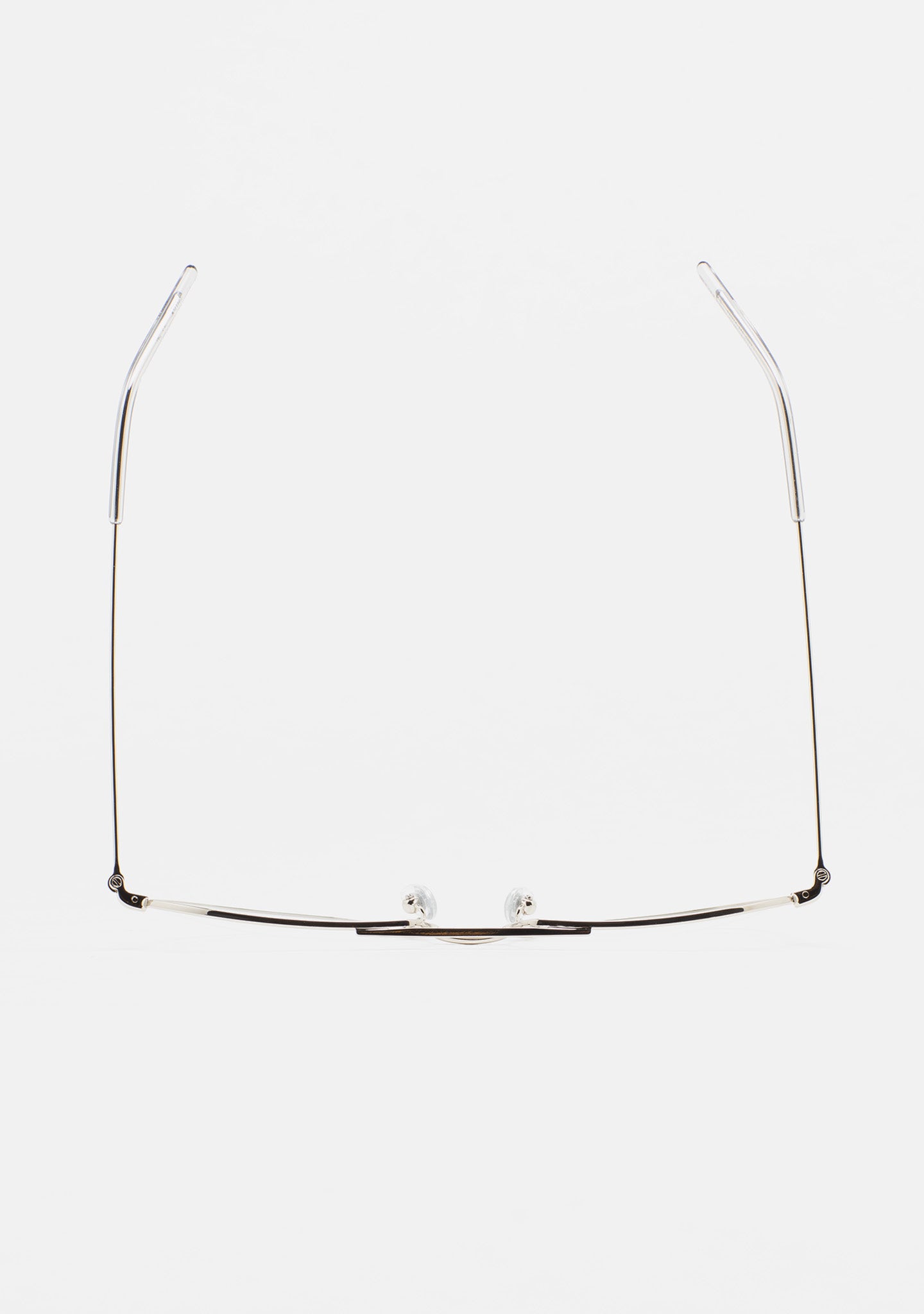 Gafa de ver de forma aviador con doble puente. Frontal y varillas de acero inoxidable. Varillas con terminal de acetato. Plaquetas de acero inoxidable incorporadas. Hecha a mano.