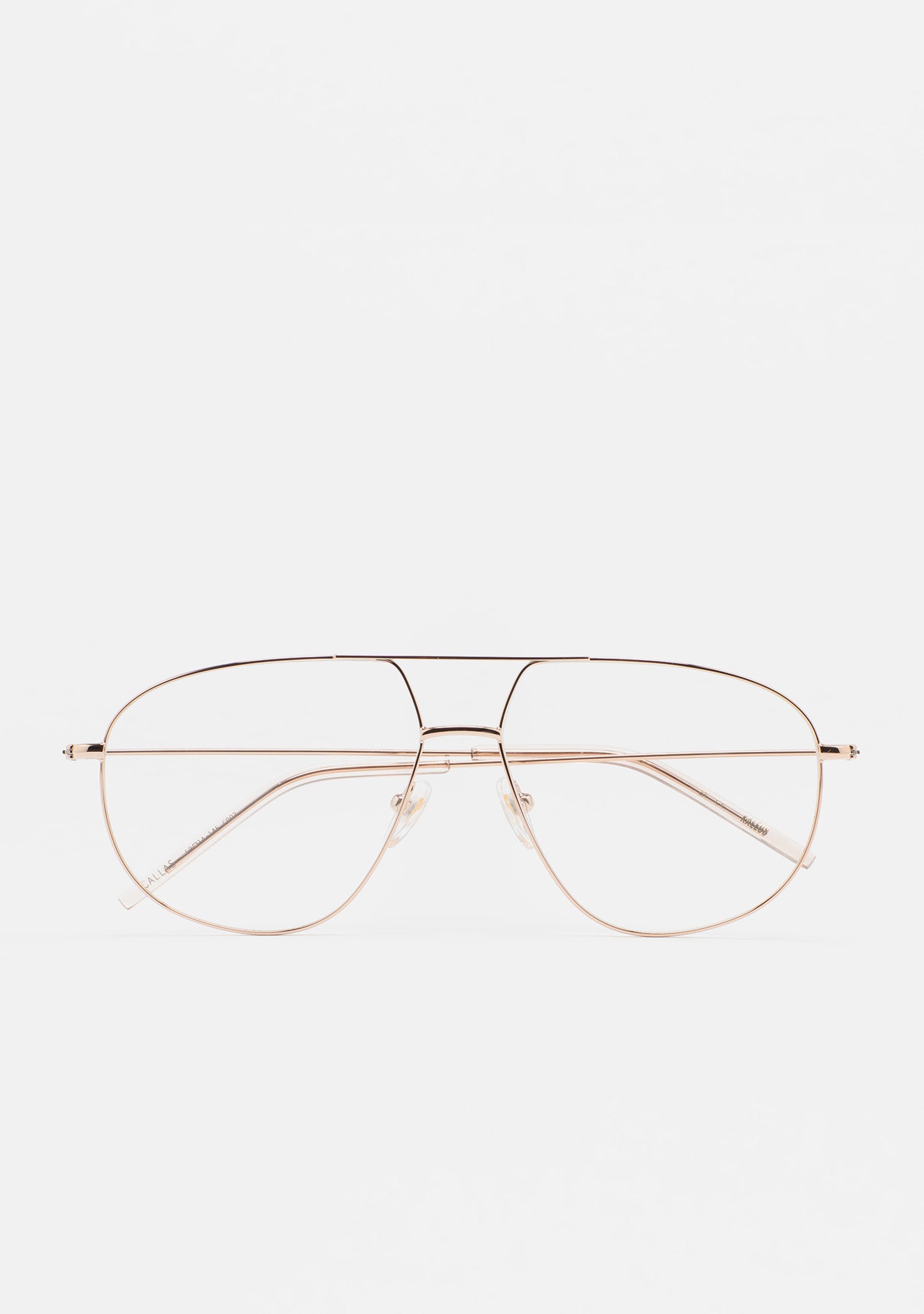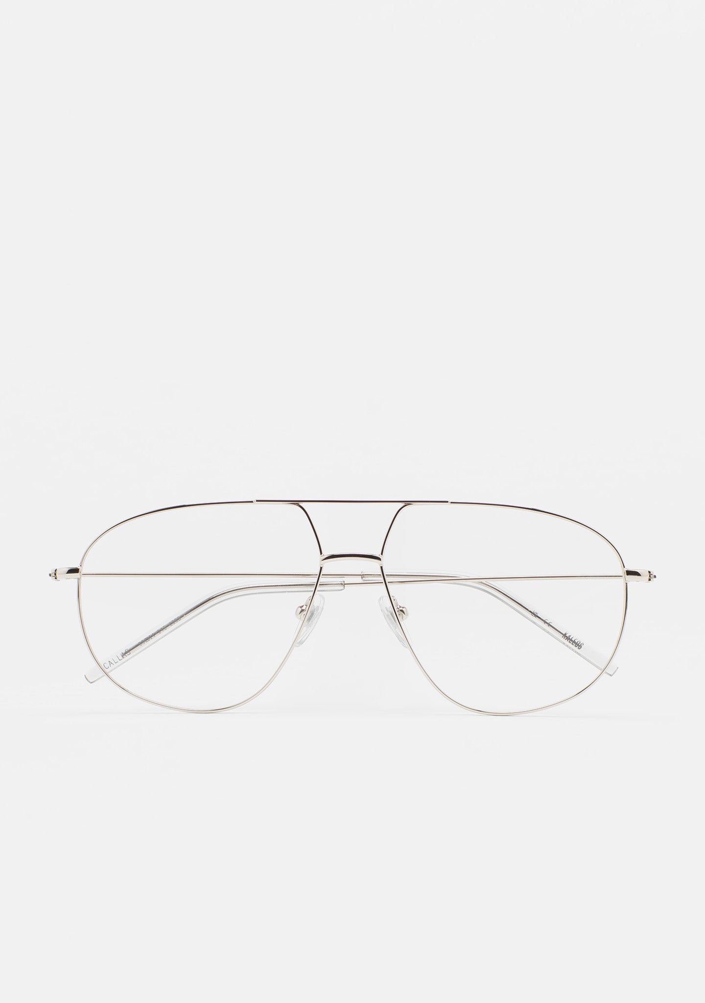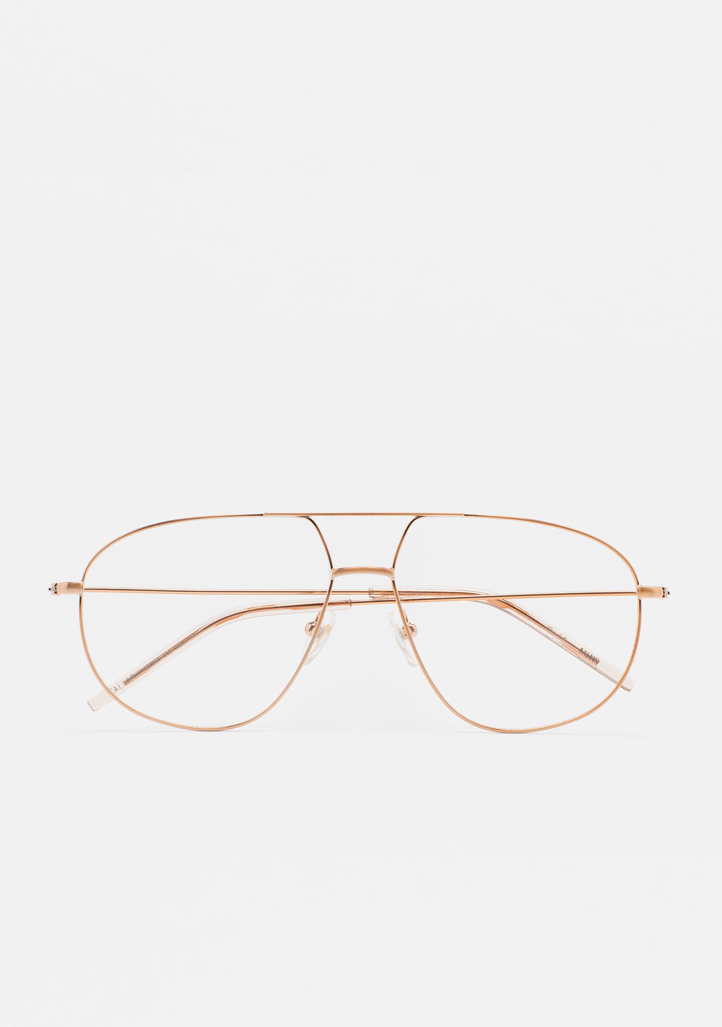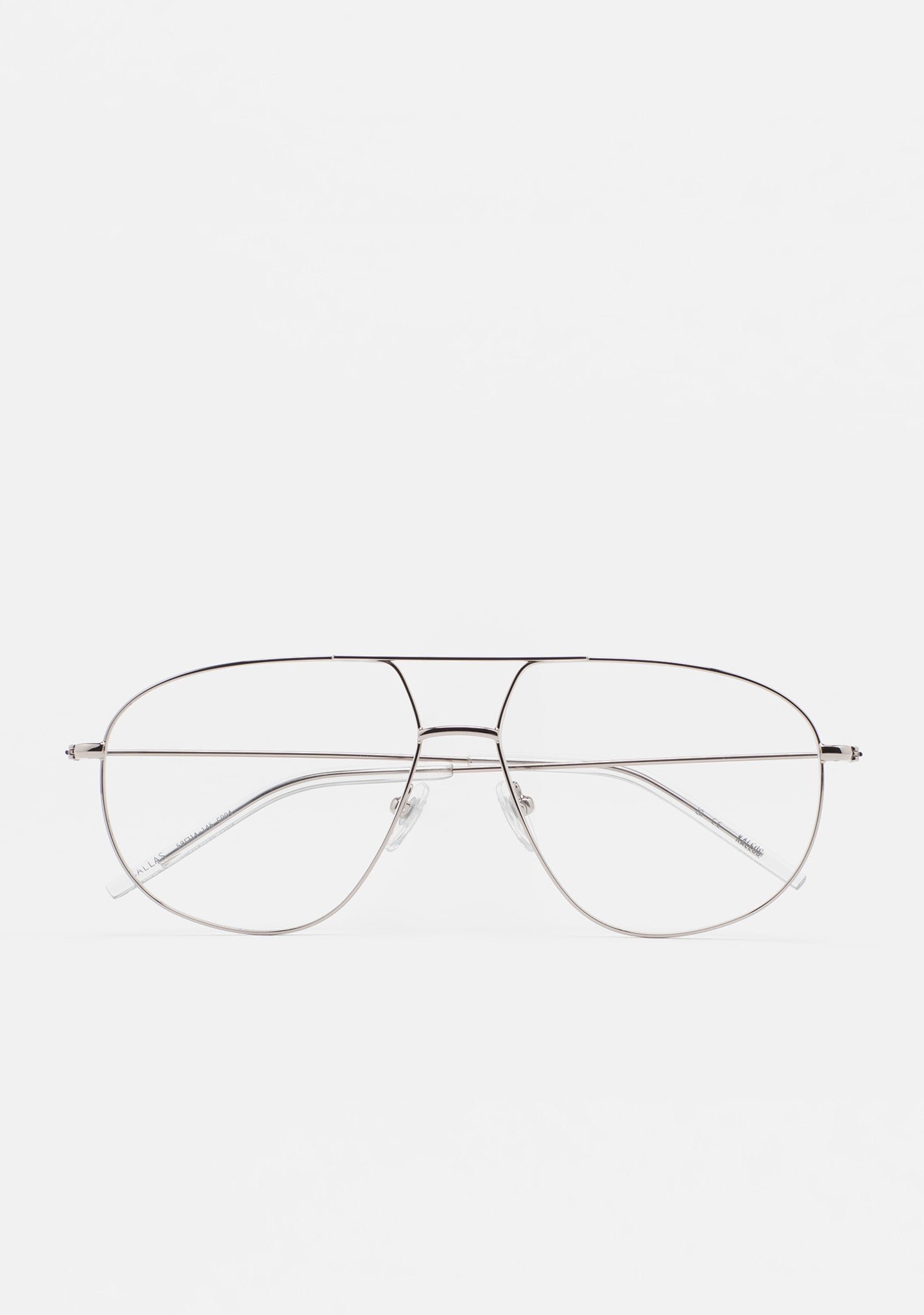 Gafa de ver de forma aviador con doble puente. Frontal y varillas de acero inoxidable. Varillas con terminal de acetato. Plaquetas de acero inoxidable incorporadas. Hecha a mano.