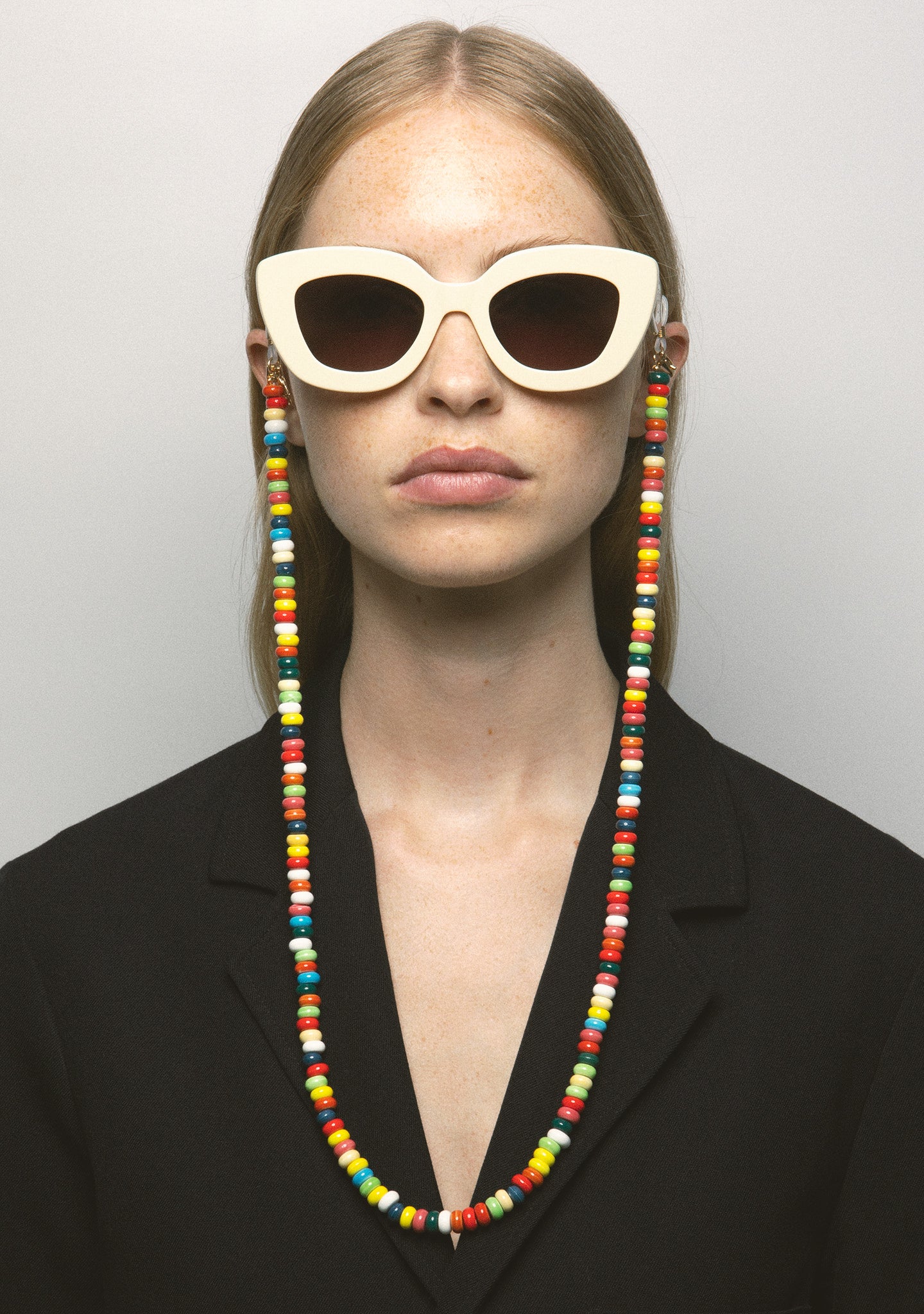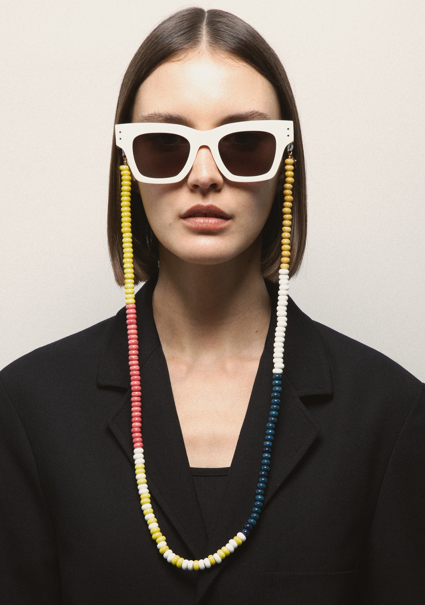Cadena de cuentas de cerámica con diferentes bloques de color. Doble gancho para sujetar la gafa y plaqueta de logo kaleos. 80 cm.