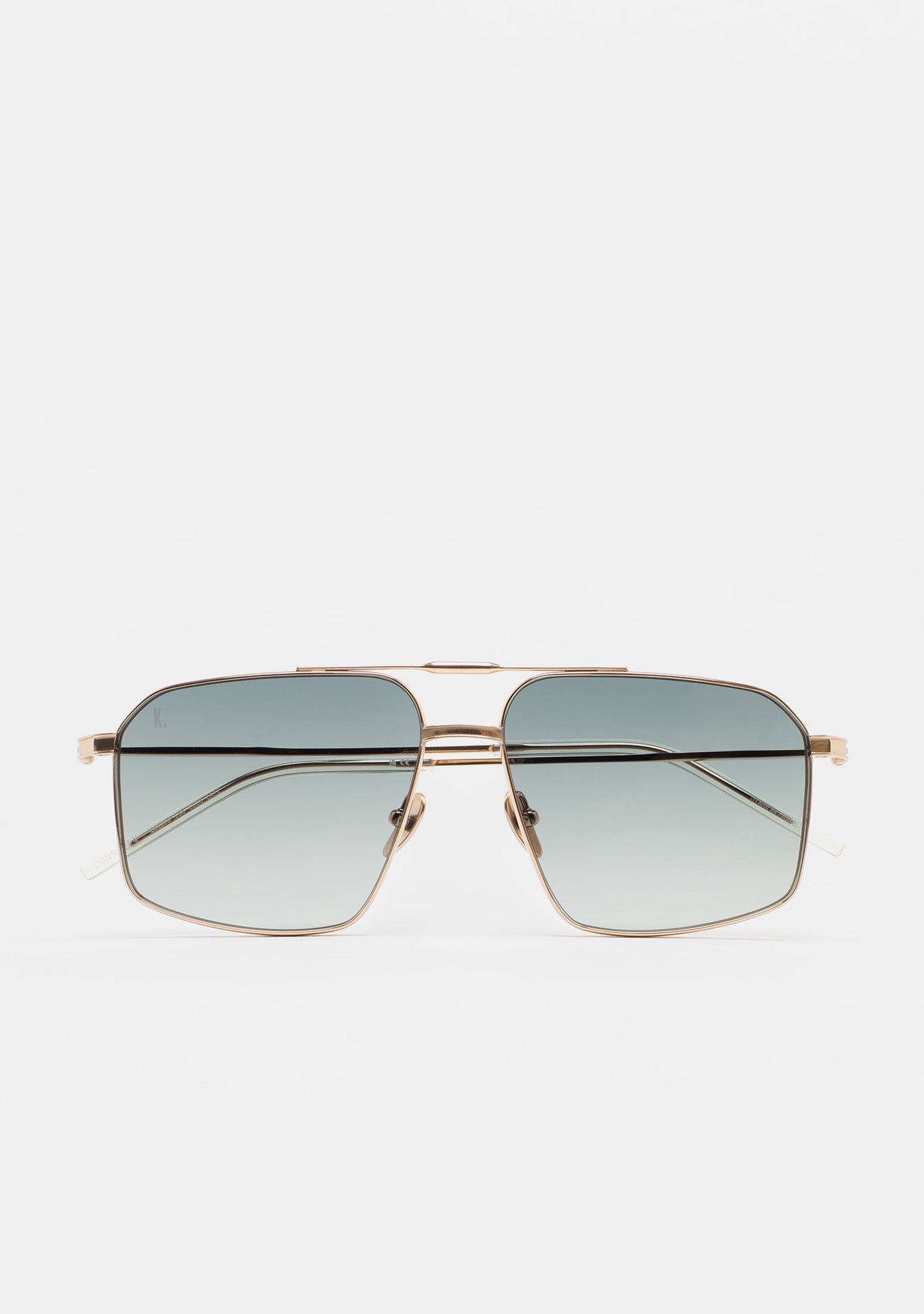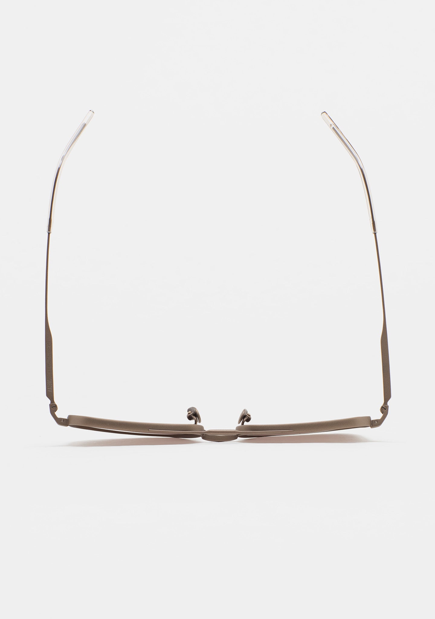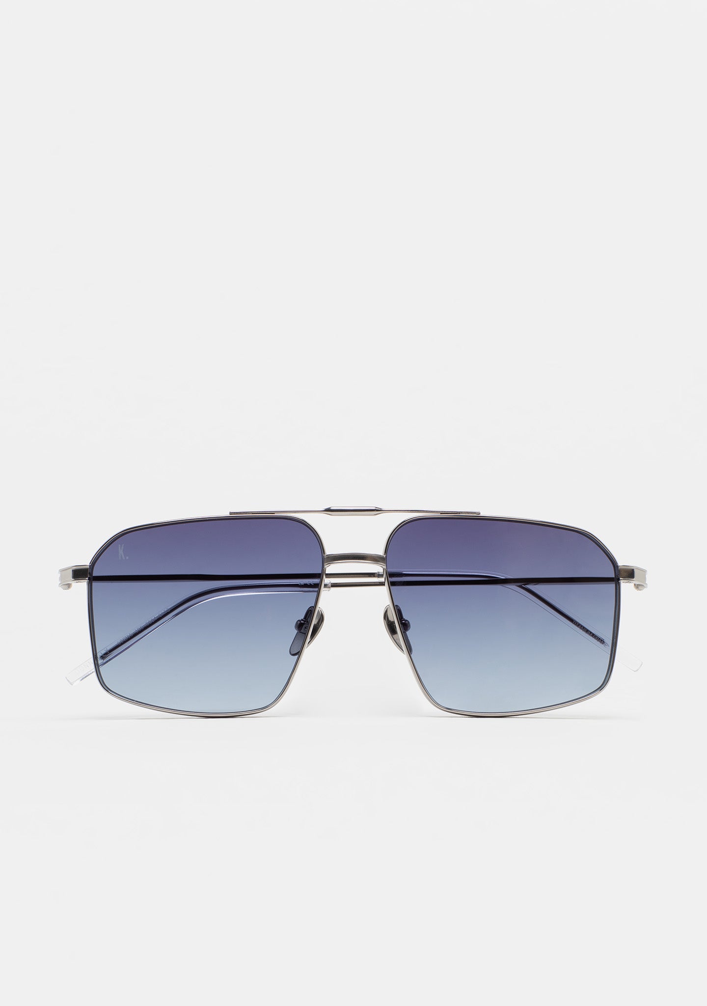 Gafa de sol de forma cuadrada con doble puente. Frontal y varillas de titanio. Varillas con terminal de acetato. Lente base 2 con 100% protección UV y tratamiento antirreflejante. Lente categoría 3. Plaquetas incorporadas. Hecha a mano.