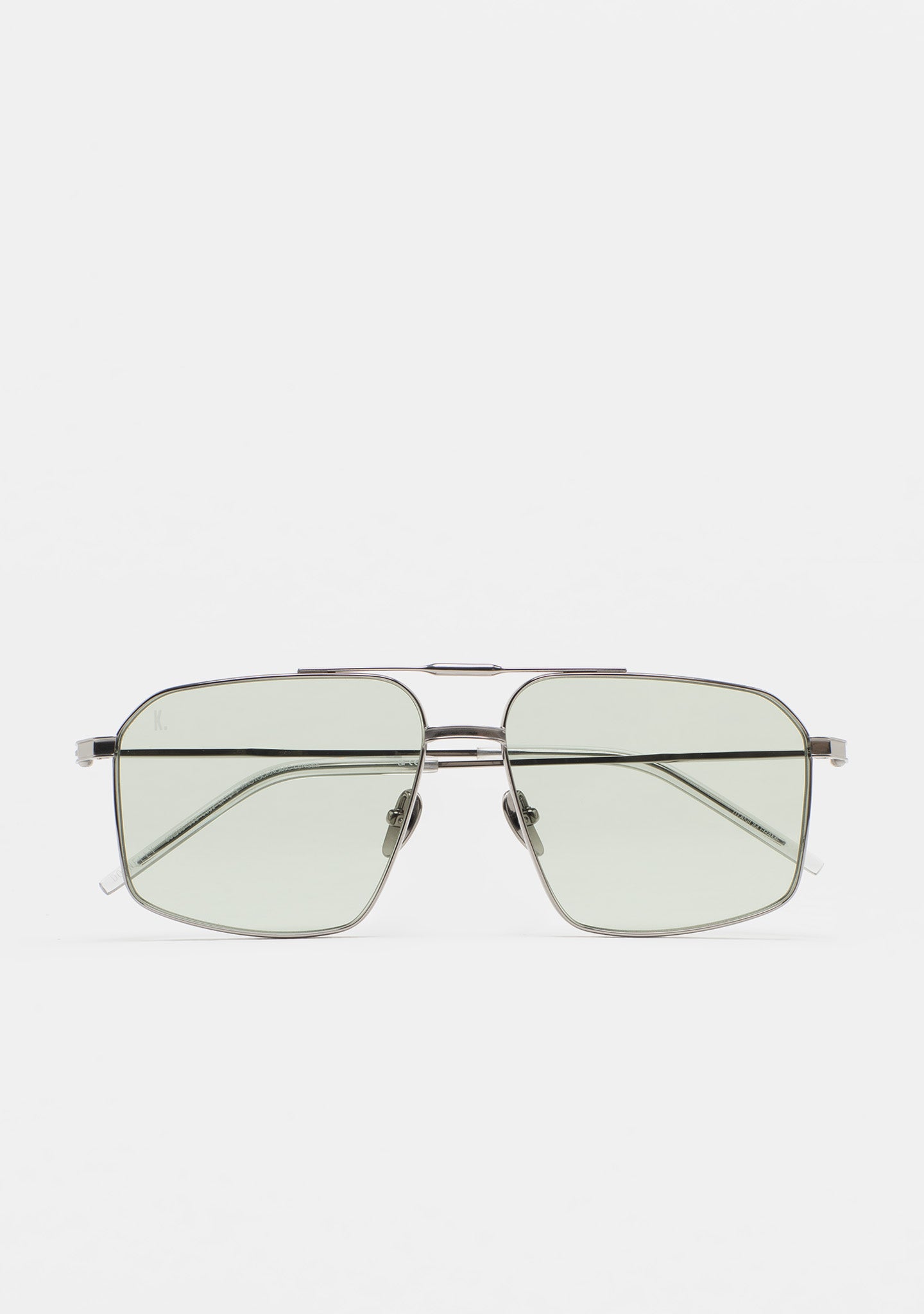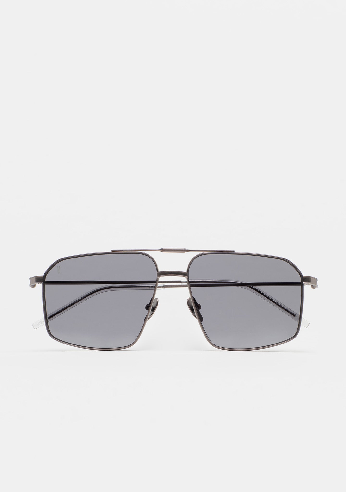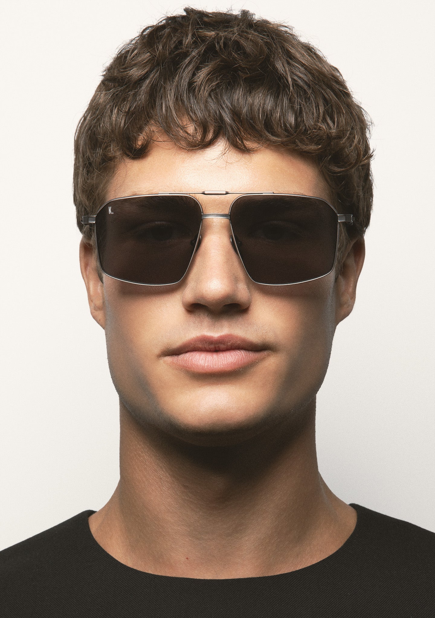 Gafa de sol de forma cuadrada con doble puente. Frontal y varillas de titanio. Varillas con terminal de acetato. Lente base 2 con 100% protección UV y tratamiento antirreflejante. Lente categoría 3. Plaquetas incorporadas. Hecha a mano.