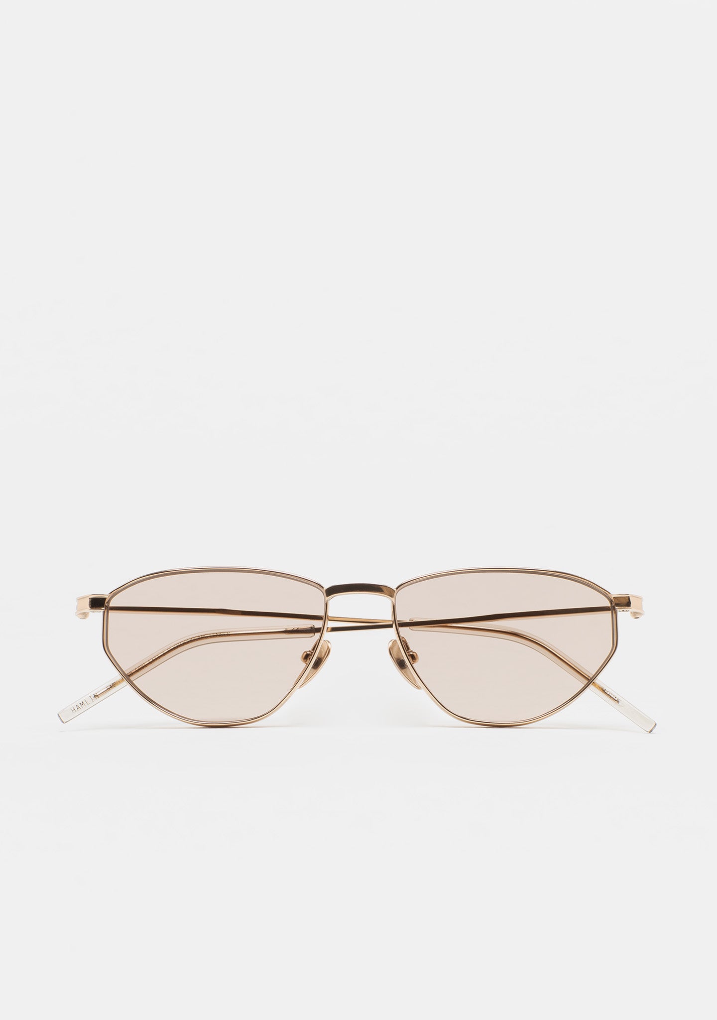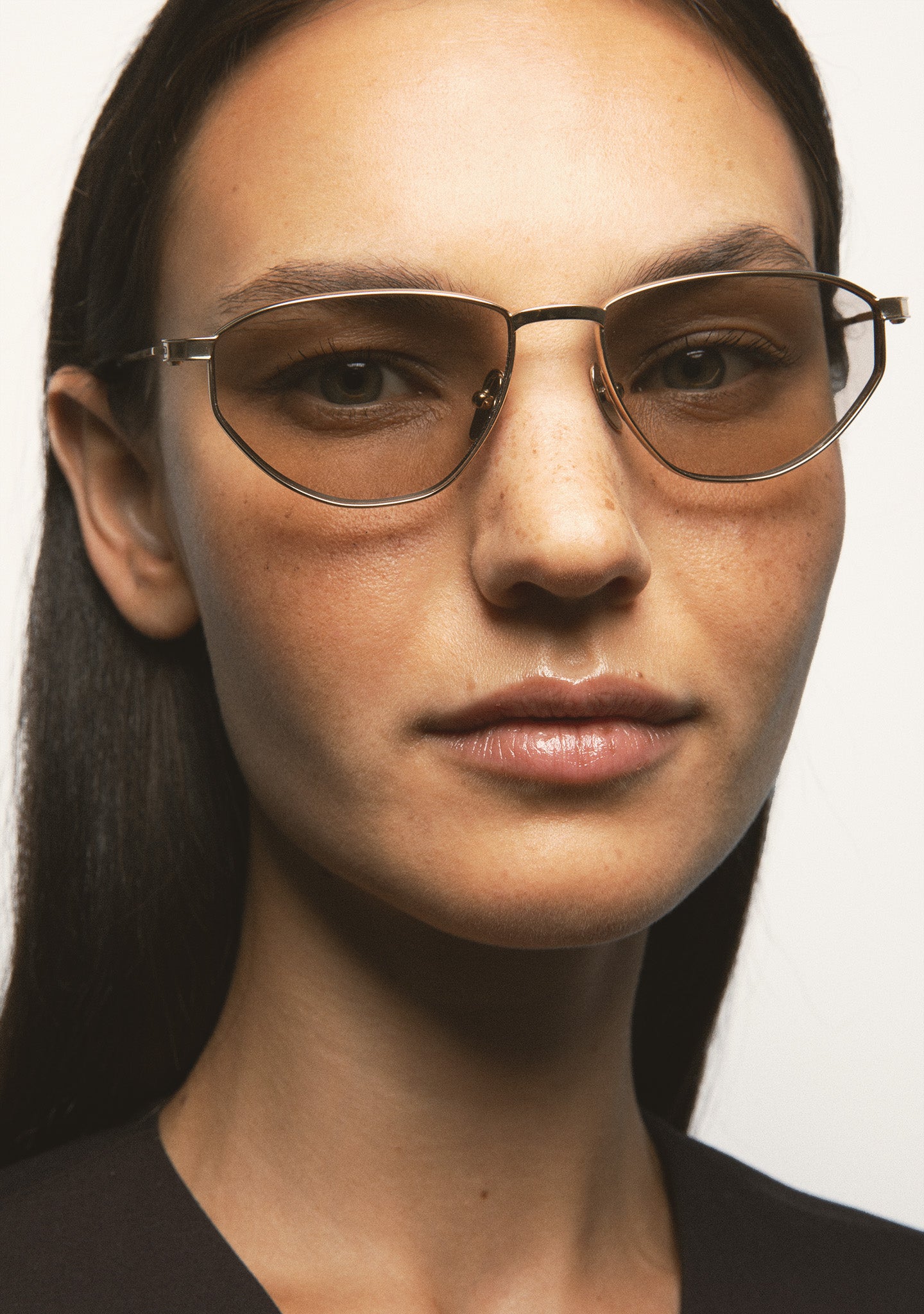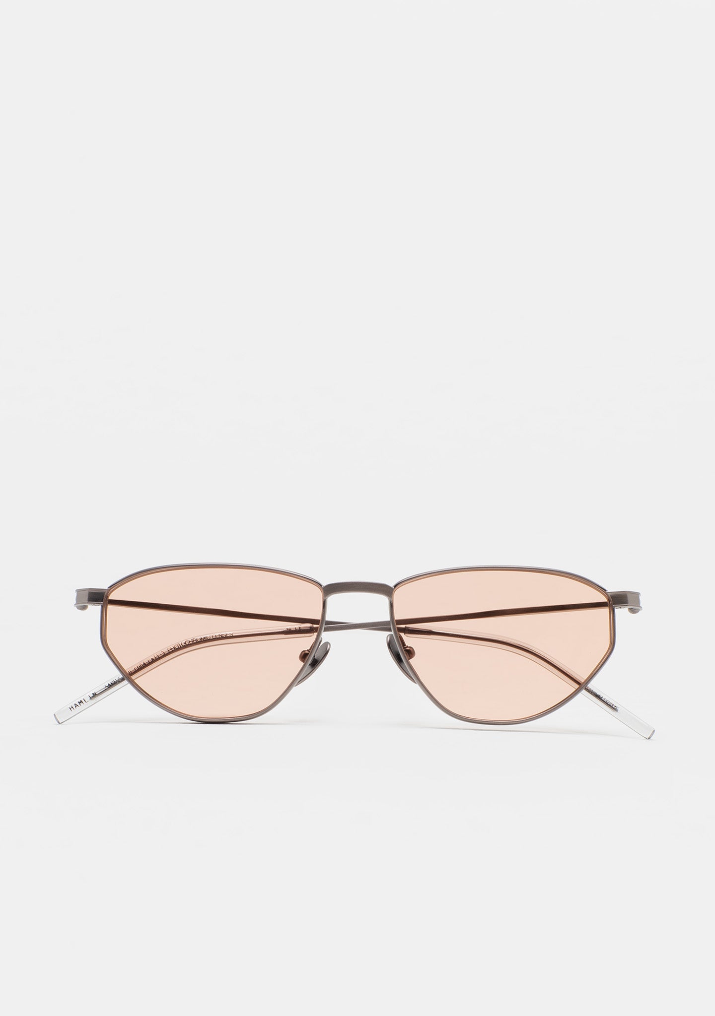 Gafa de sol de forma ojo-de-gato. Frontal y varillas de titanio. Varillas con terminal de acetato. Lente base 2 con protección UV y tratamiento antirreflejante. Lente categoría 1-3. Plaquetas incorporadas. Hecha a mano.