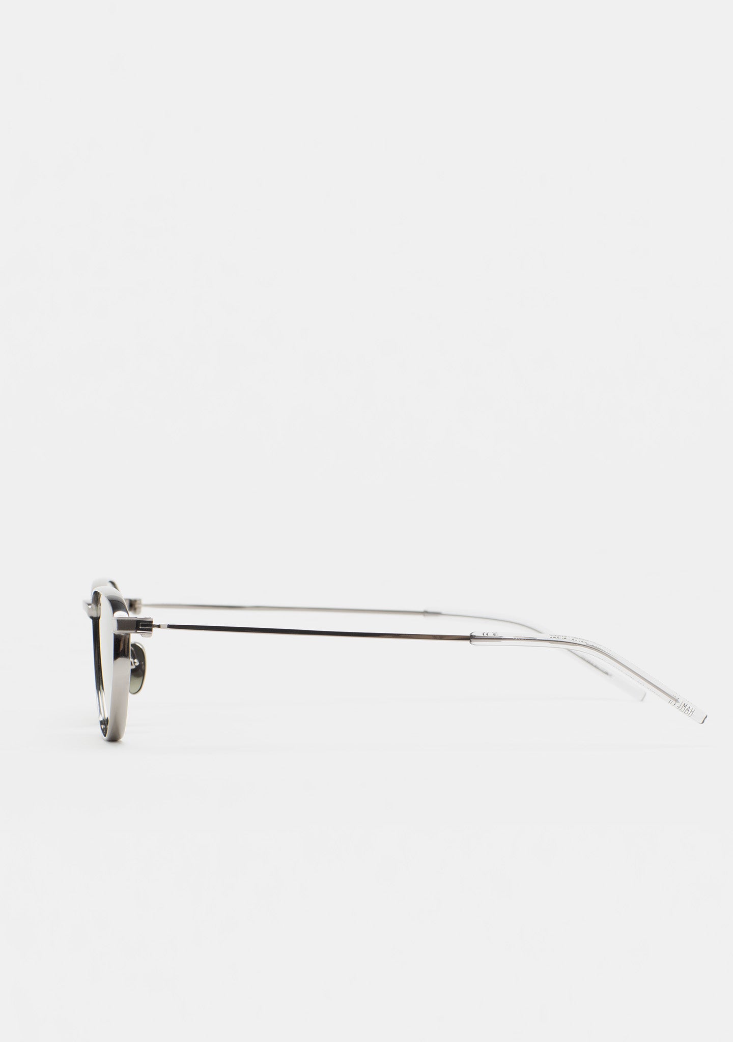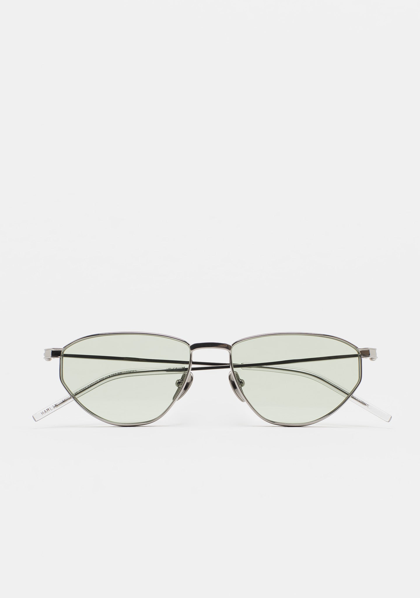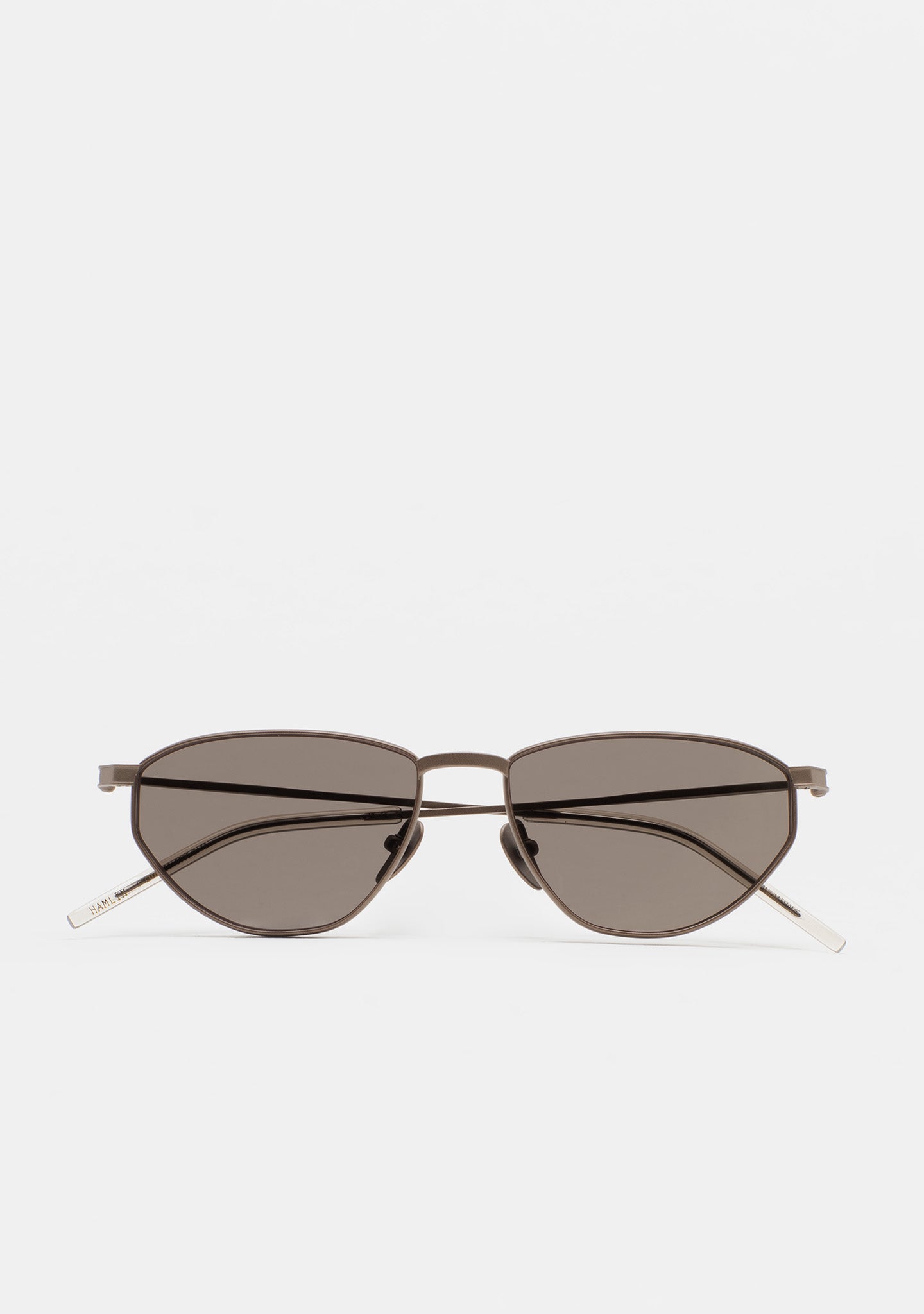Gafa de sol de forma ojo-de-gato. Frontal y varillas de titanio. Varillas con terminal de acetato. Lente base 2 con protección UV y tratamiento antirreflejante. Lente categoría 1-3. Plaquetas incorporadas. Hecha a mano.