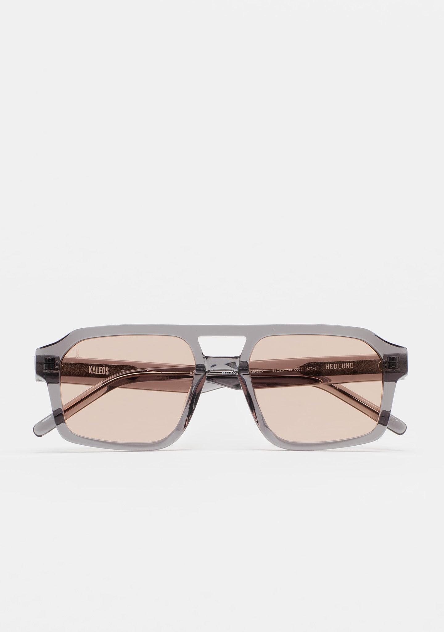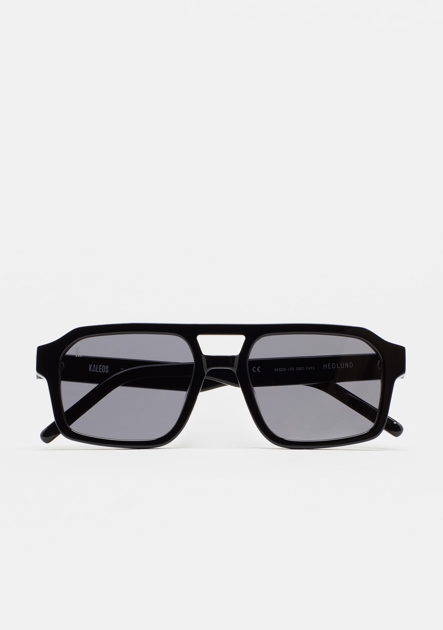 Gafa de sol de forma rectangular con doble puente. Frontal y varillas de acetato. Lente base 2 con 100% protección UV y tratamiento antirreflejante. Lente categoría 3. Plaquetas de acetato incorporadas. Hecha a mano.