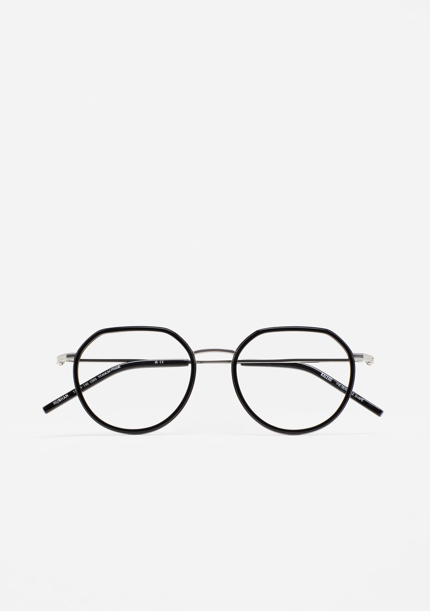 Gafa de ver de forma redonda con la ceja plana. Frontal de estructura de titanio fino con cerquillo por dentro de la estructura de acetato high density. Puente y varillas de titanio. Varillas con terminal de acetato. Plaquetas de acetato incorporadas. Hecha a mano.
