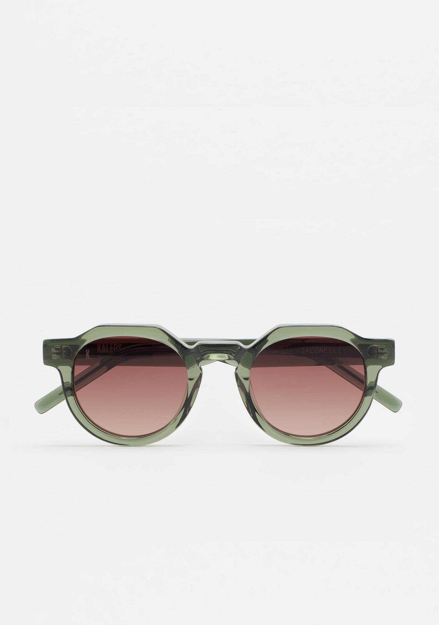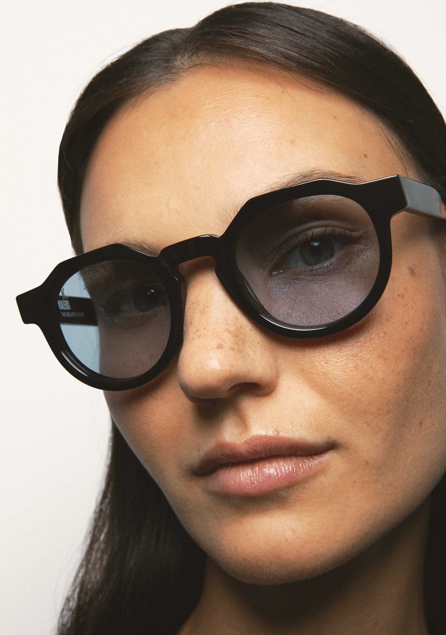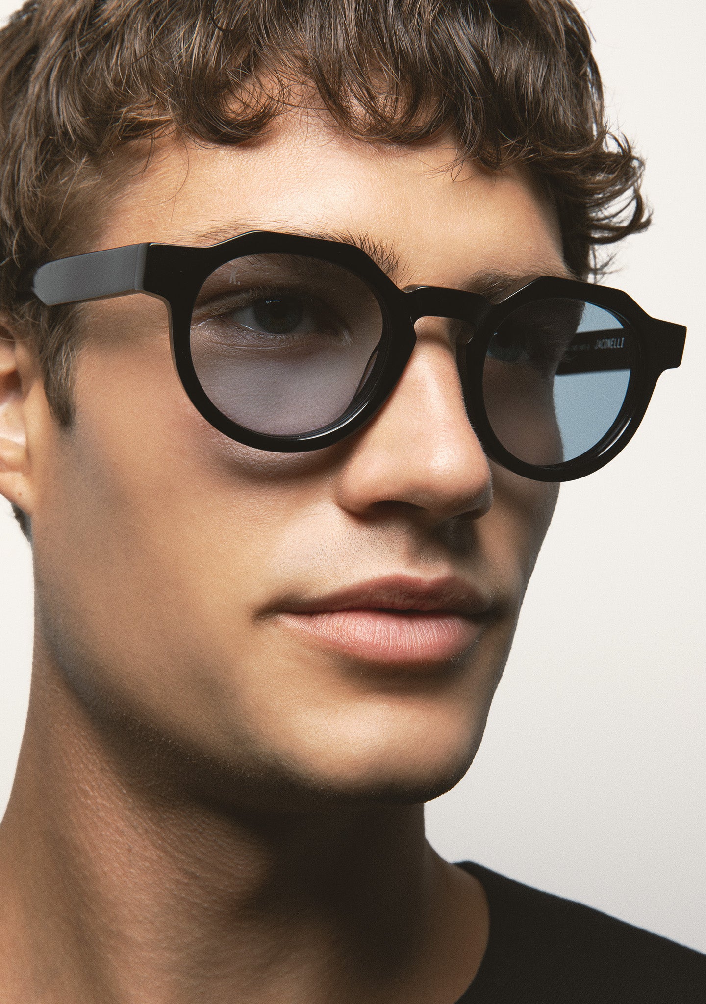 Gafa de sol de forma pantos con ceja plana y puente en llave. Frontal y varillas de acetato. Lente base 2 con protección UV y tratamiento antirreflejante. Lente categoría 1-3. Plaquetas de acetato incorporadas. Hecha a mano.