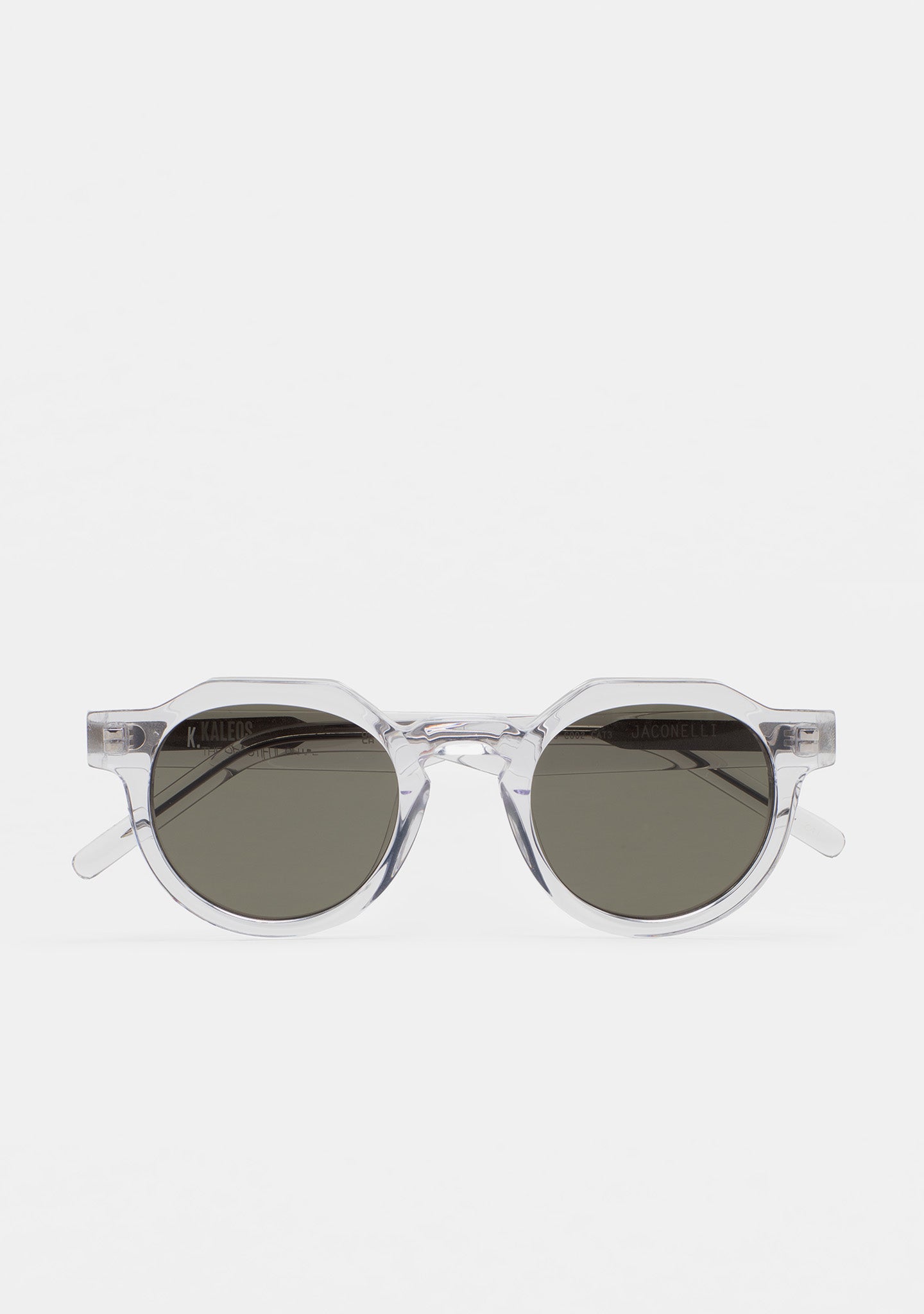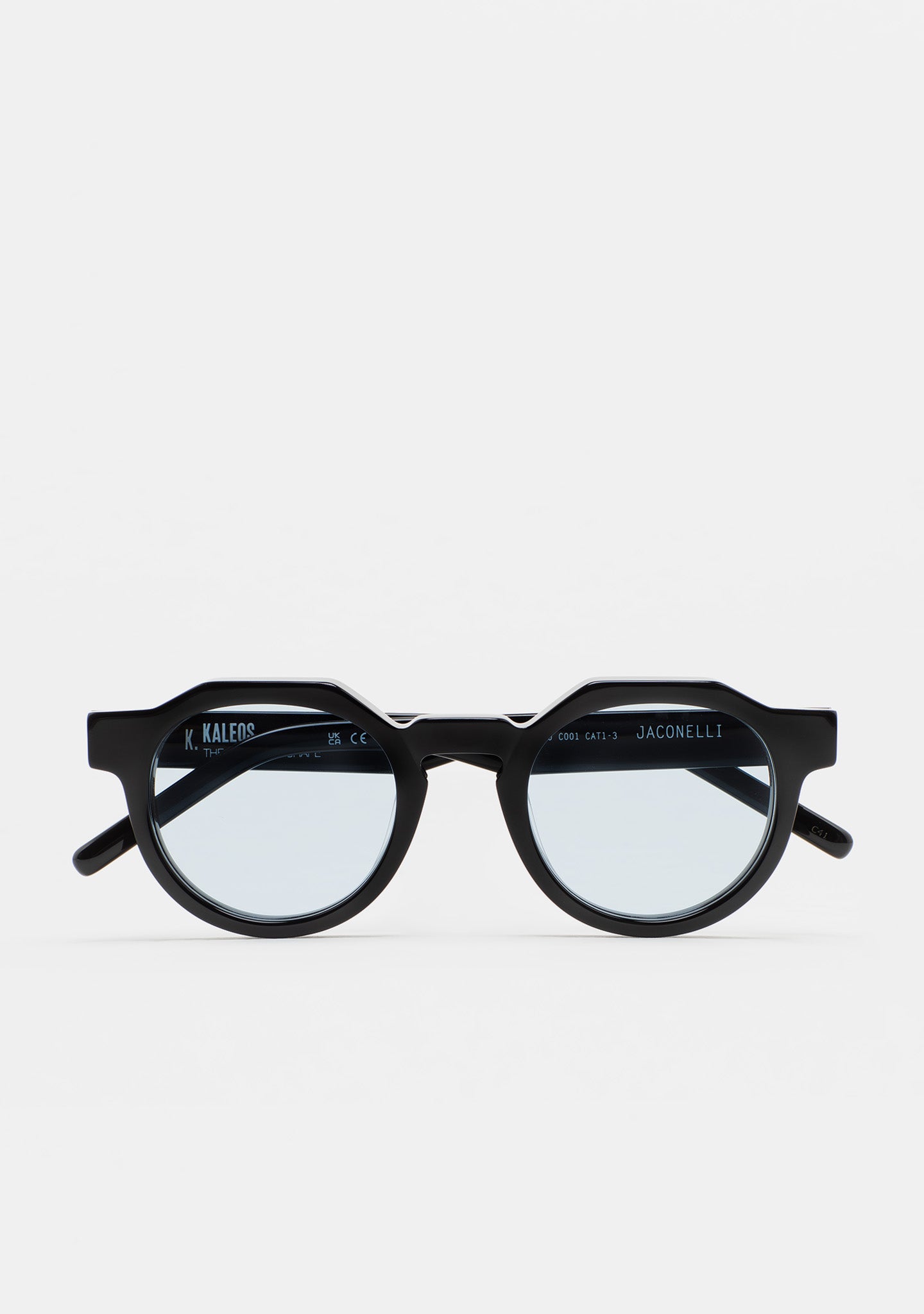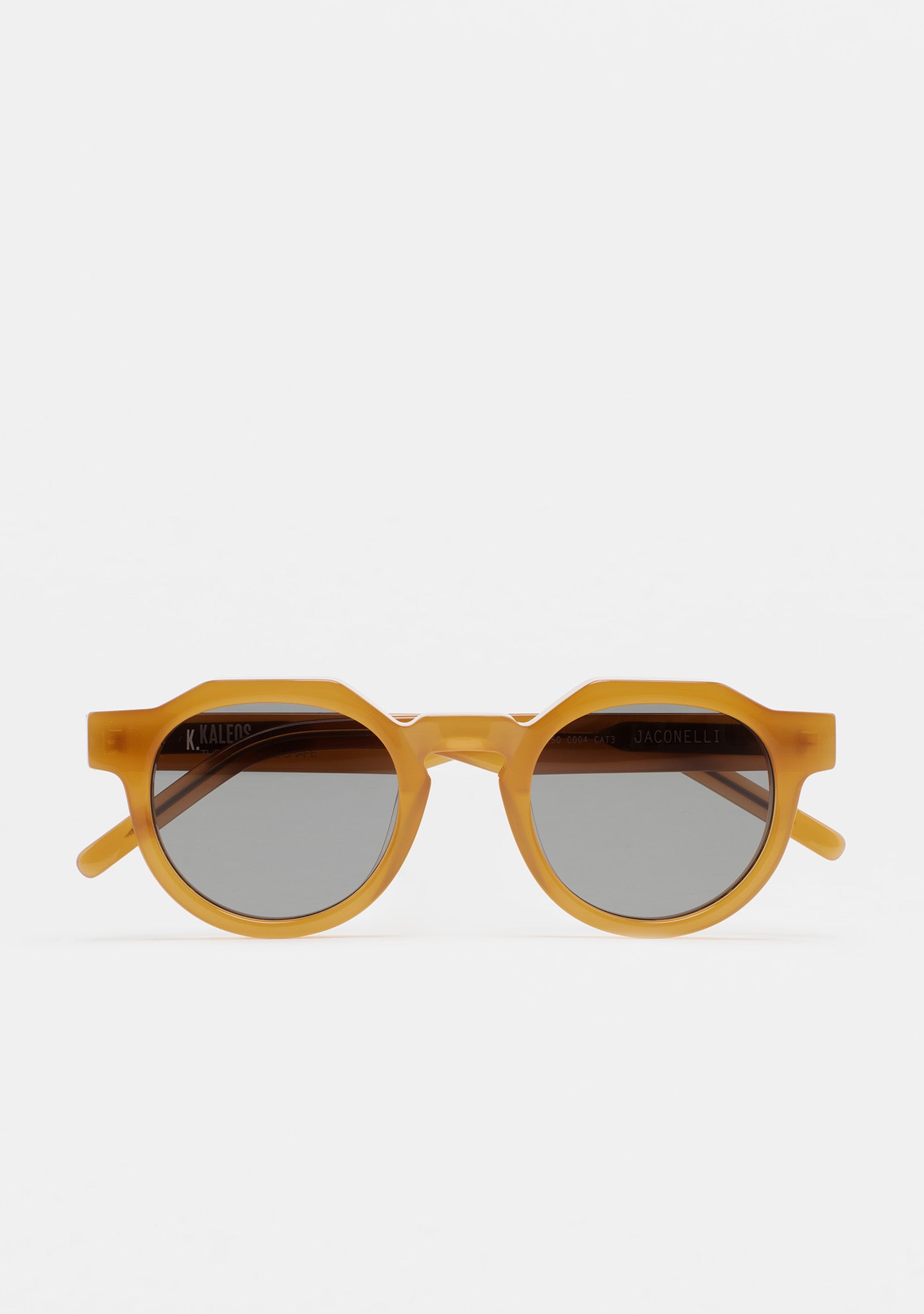 Gafa de sol de forma pantos con ceja plana y puente en llave. Frontal y varillas de acetato. Lente base 2 con protección UV y tratamiento antirreflejante. Lente categoría 1-3. Plaquetas de acetato incorporadas. Hecha a mano.