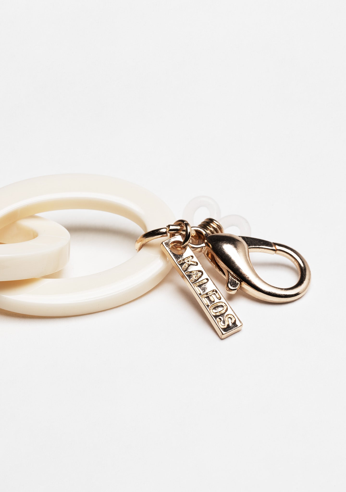 Cadena de eslabones ovalados beige. Doble cierre dorado para usar como collar y goma de silicona para sujetar la gafa. Plaqueta de logo KALEOS. 80 cm.