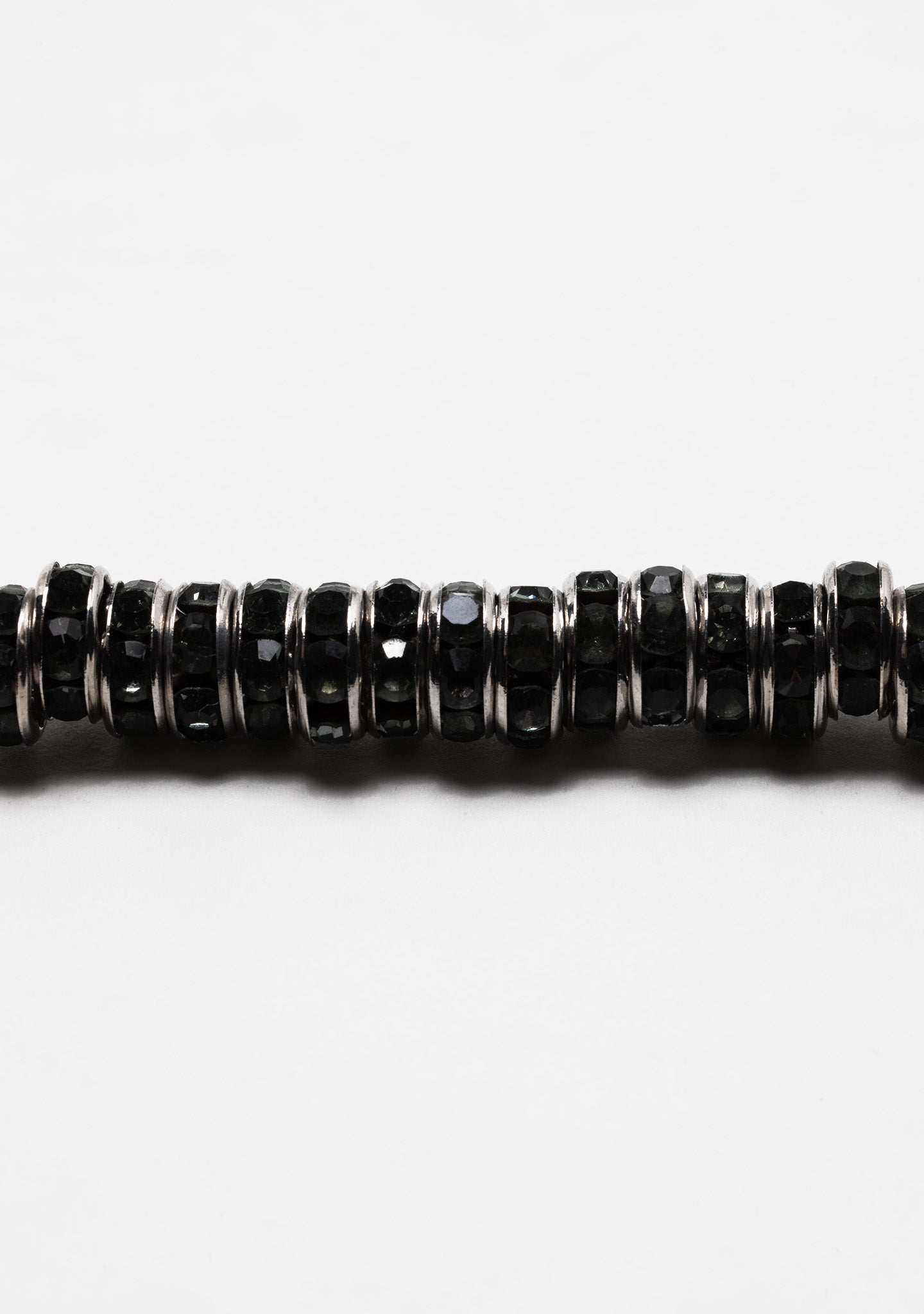 Cadena hecha por anillos metalicos con cristales incrustados. Inspiracion disco. Doble gancho para sujetar la gafa y plaqueta de logo kaleos. 80 cm.