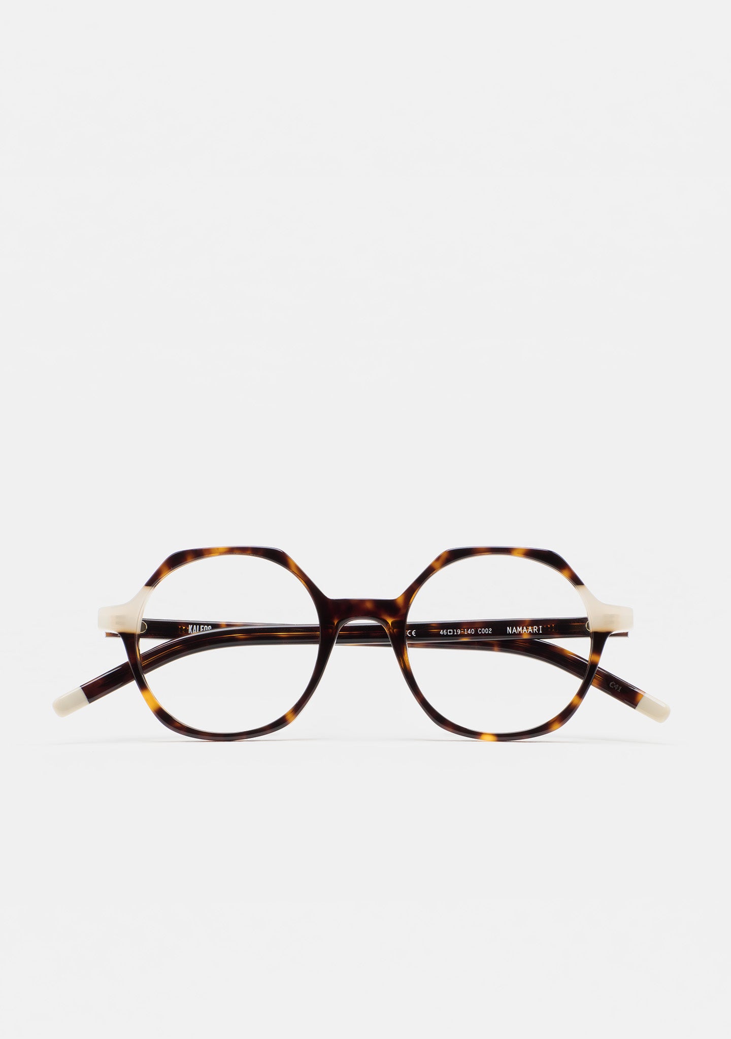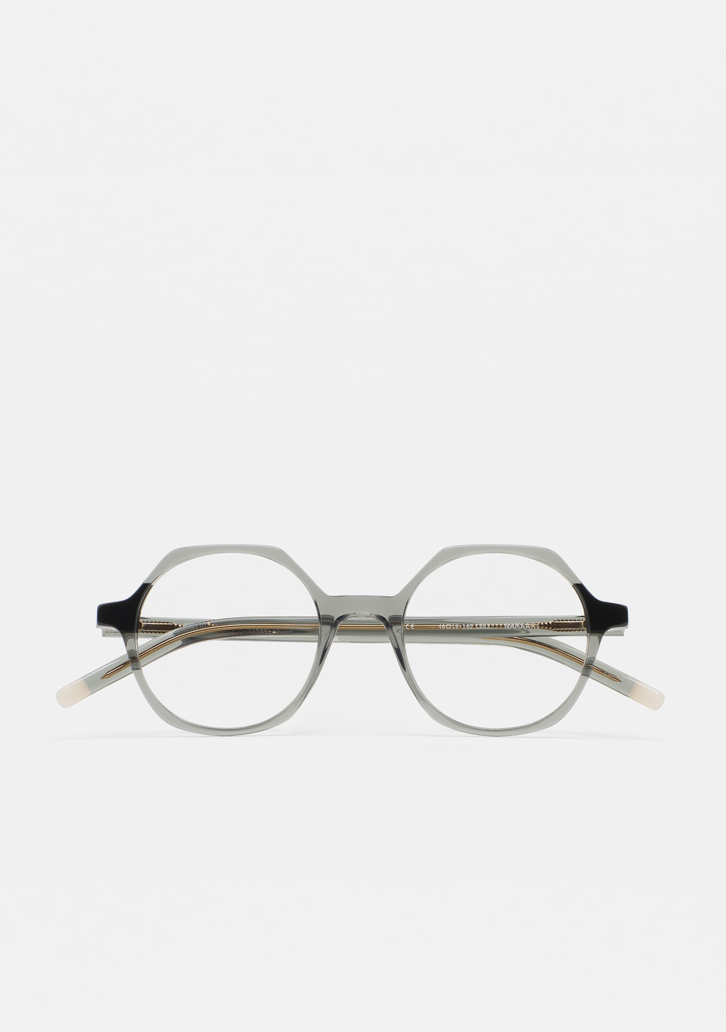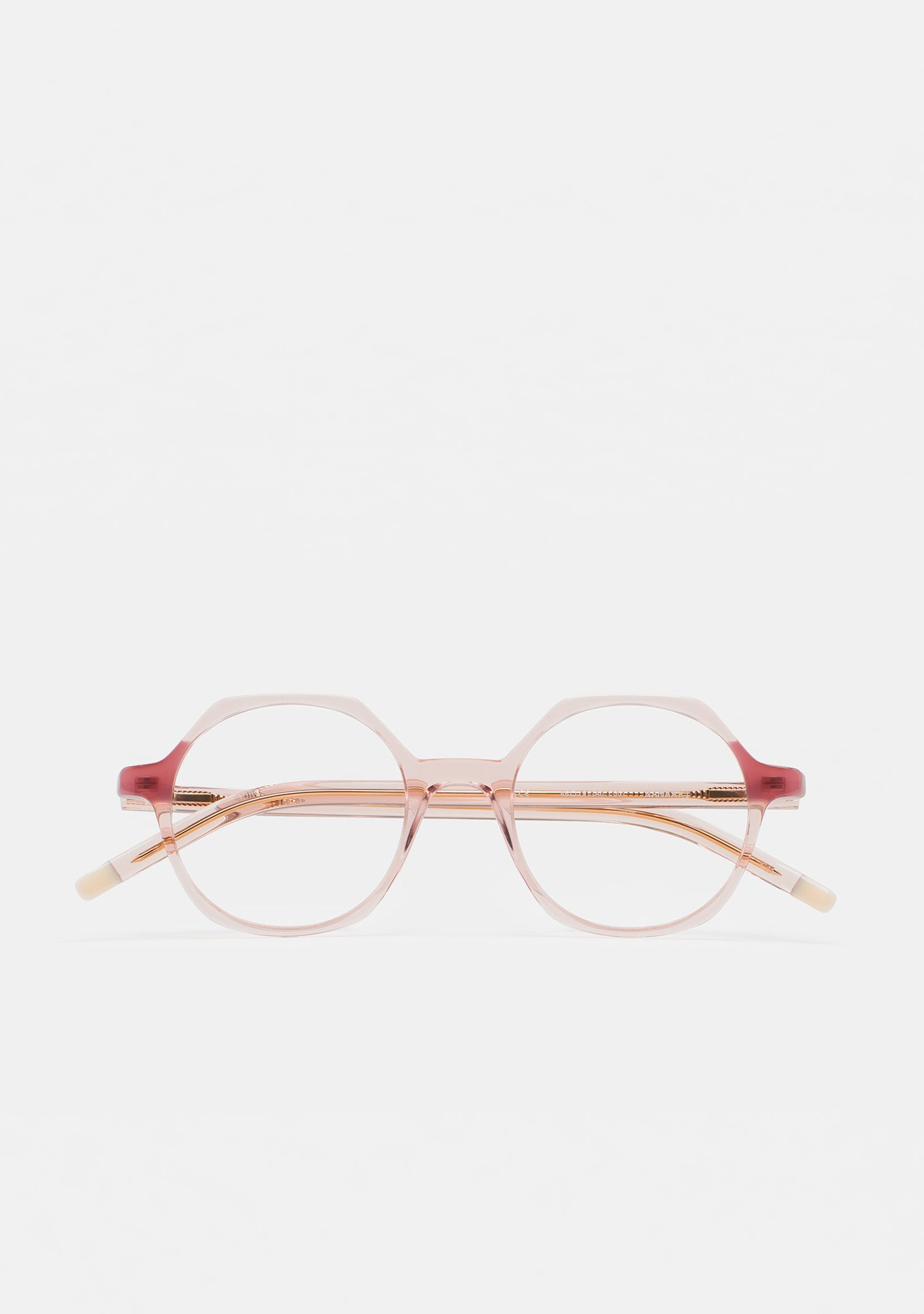 Gafa de ver KIDS de forma hexagonal. Frontal de acetato con laminado. Varillas de acetato con terminal. Plaquetas de acetato incorporadas. Hecha a mano.