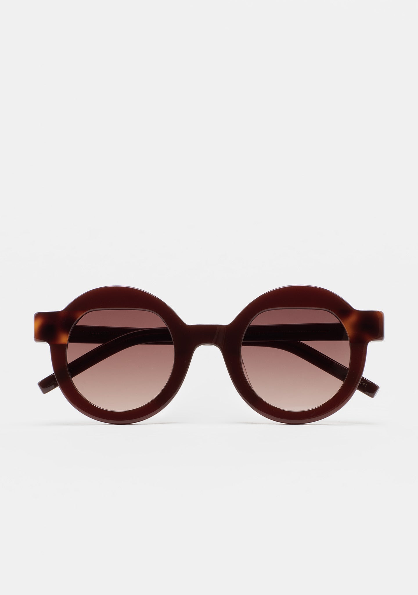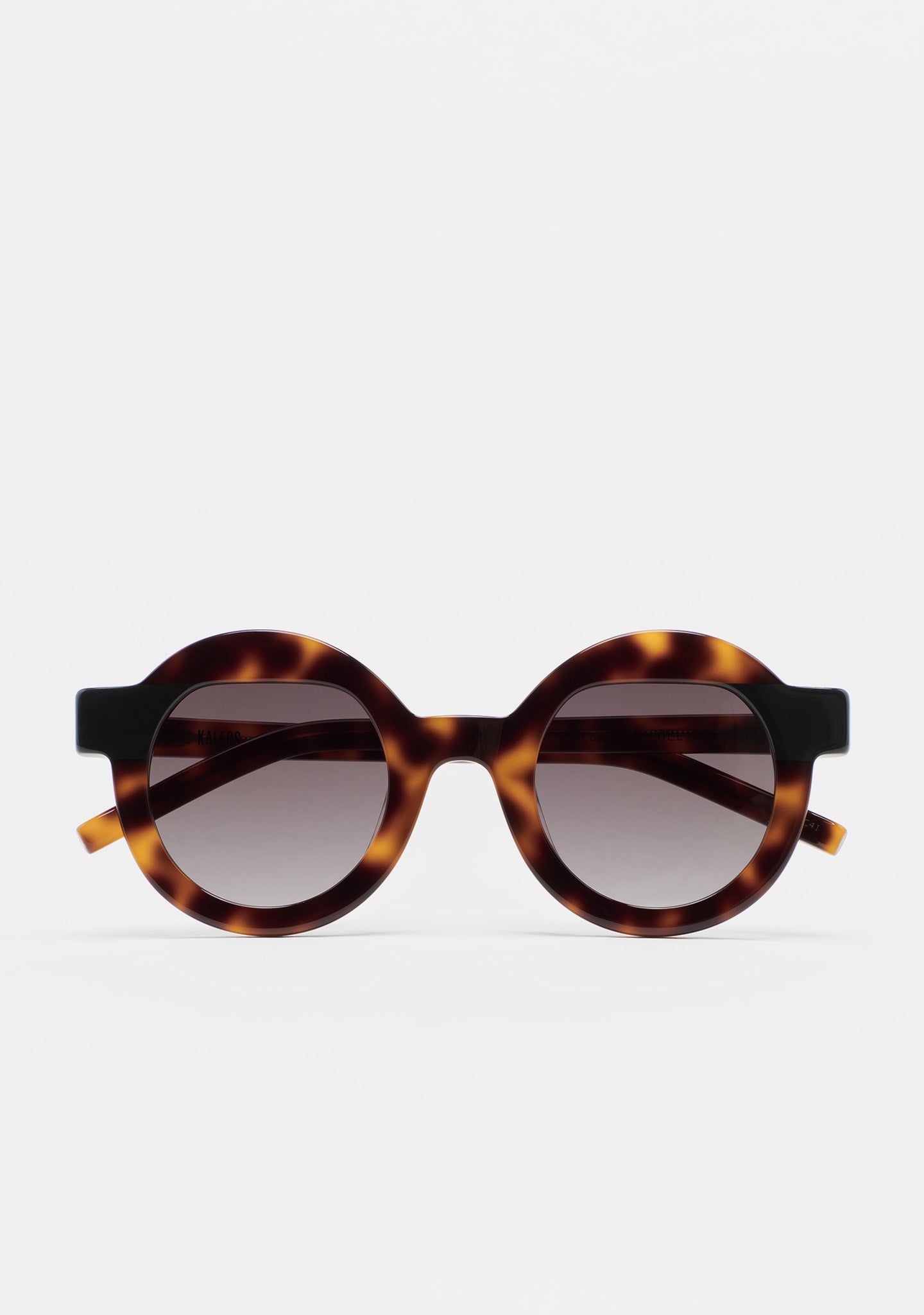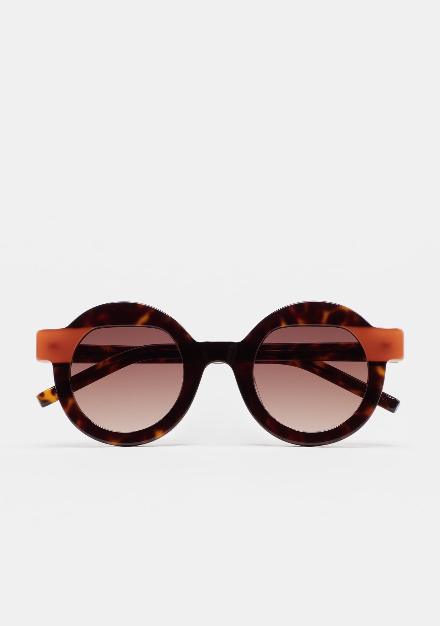 Gafa de sol de forma redondeada. Frontal de acetato con laminado. Varillas de acetato. Lente degradada base 2 con 100% protección UV y tratamiento anti-reflejante. Lente Categoría 3. Plaquetas de acetato incorporadas. Hecha a mano.