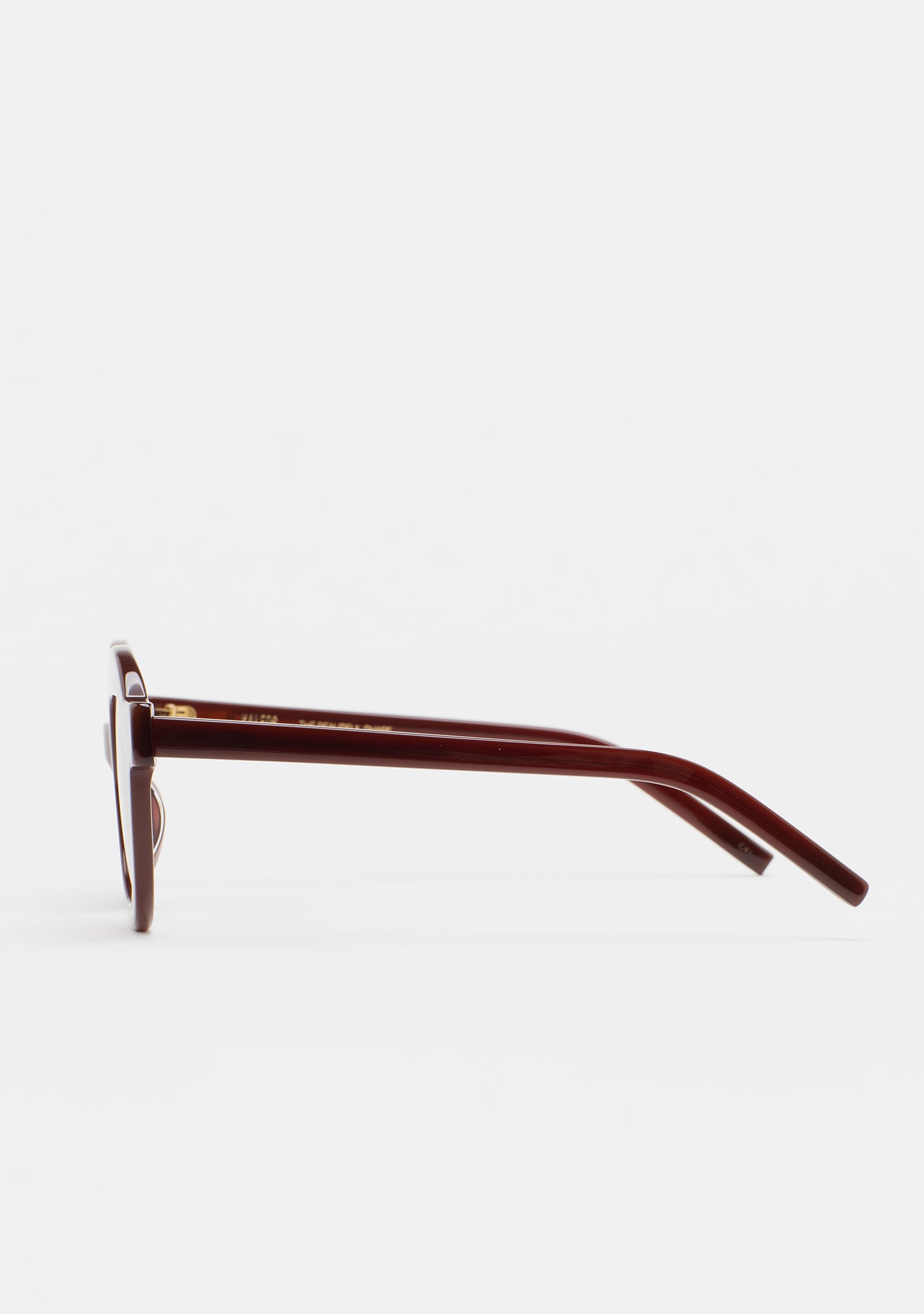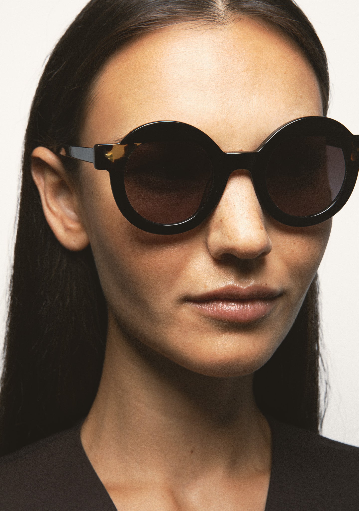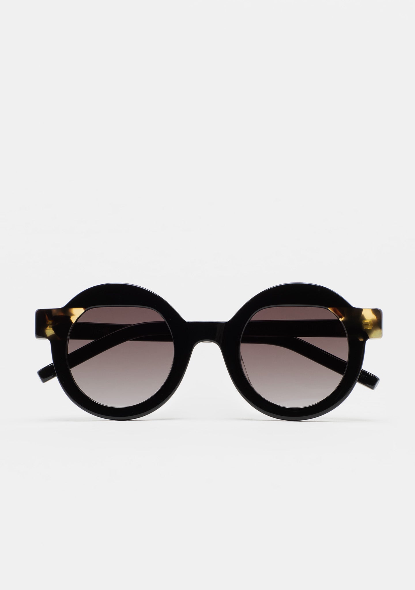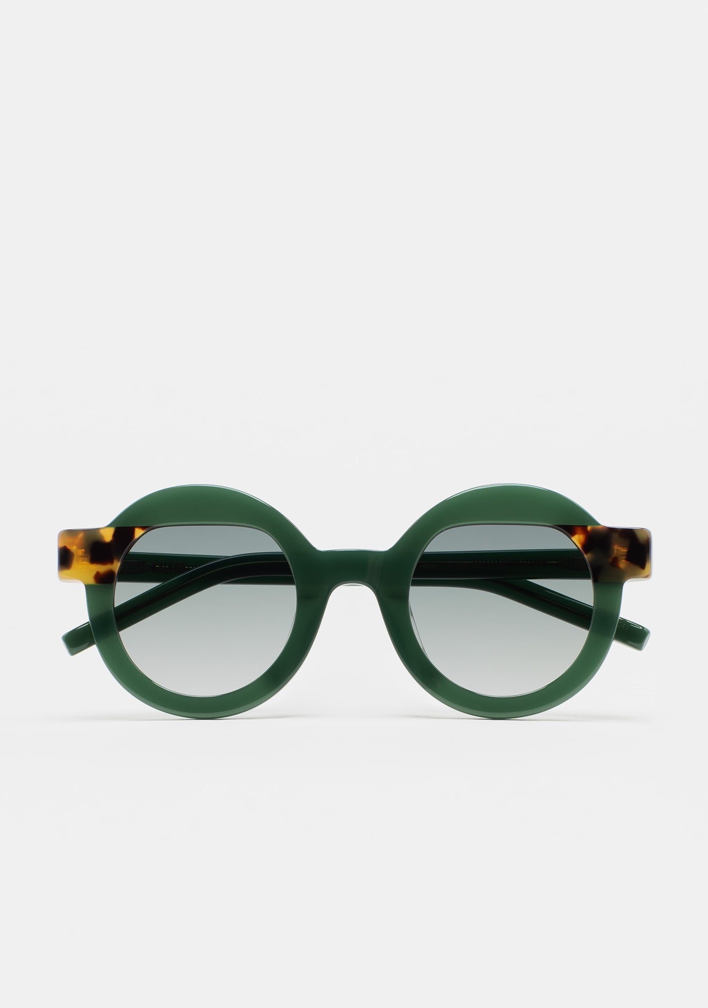 Gafa de sol de forma redondeada. Frontal de acetato con laminado. Varillas de acetato. Lente degradada base 2 con 100% protección UV y tratamiento anti-reflejante. Lente Categoría 3. Plaquetas de acetato incorporadas. Hecha a mano.