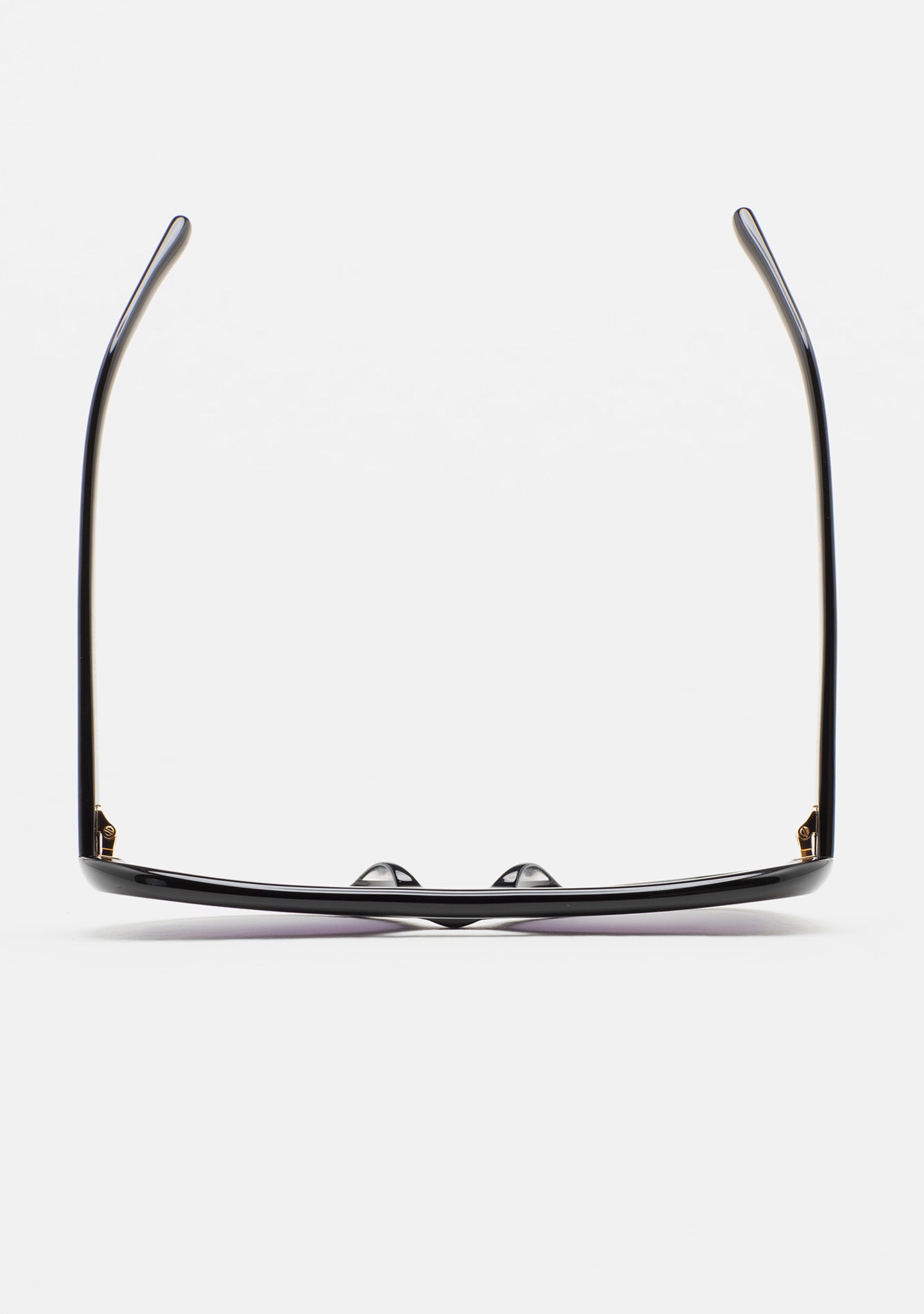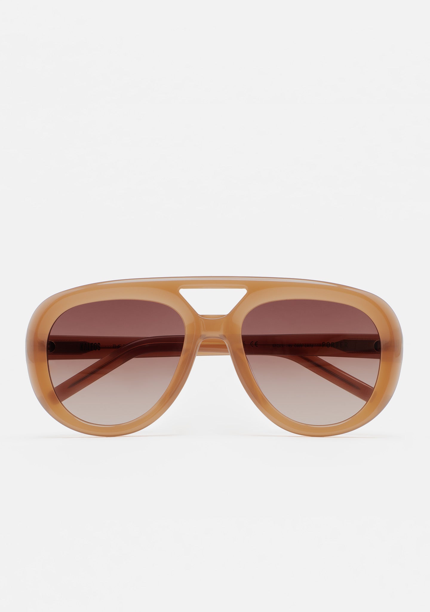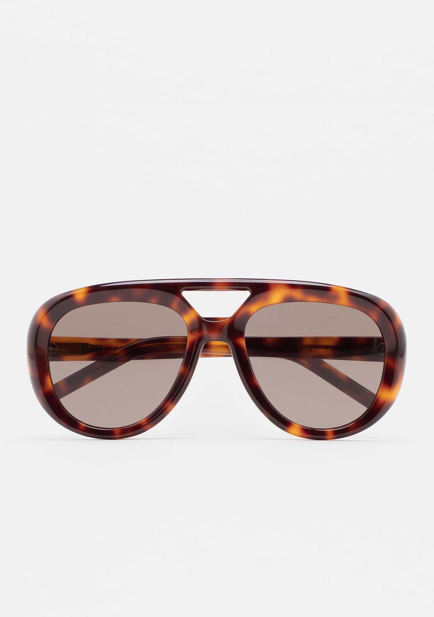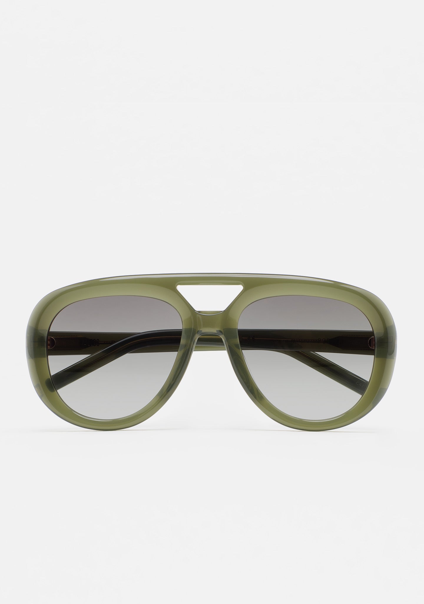 Gafa de sol de forma aviador con fresado en todo el frontal de la gafa. Frontal y varillas de acetato. Lente base 2 con 100% protección UV y tratamiento antirreflejante. Lente Categoría 3. Plaquetas de acetato incorporadas. Hecha a mano.