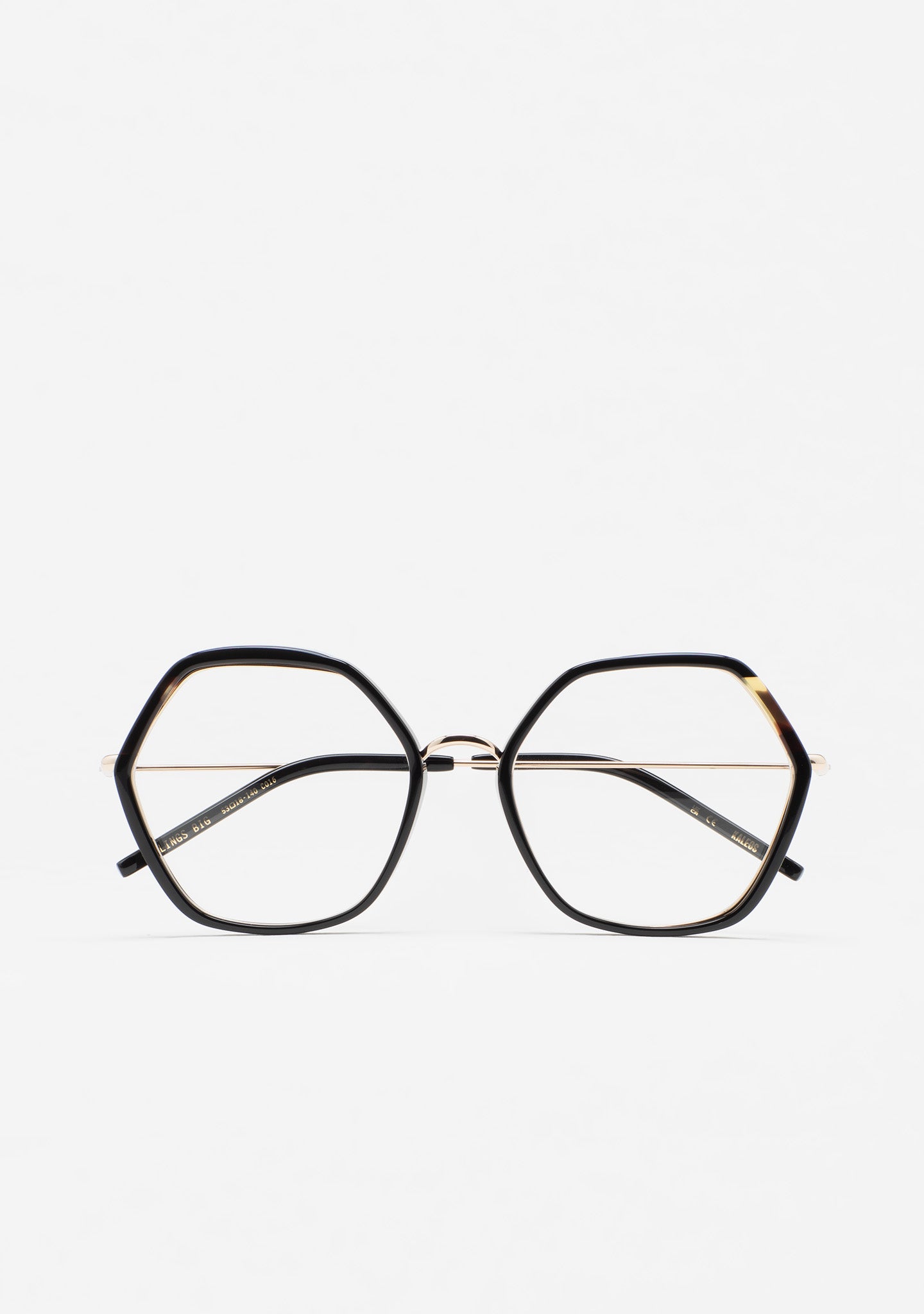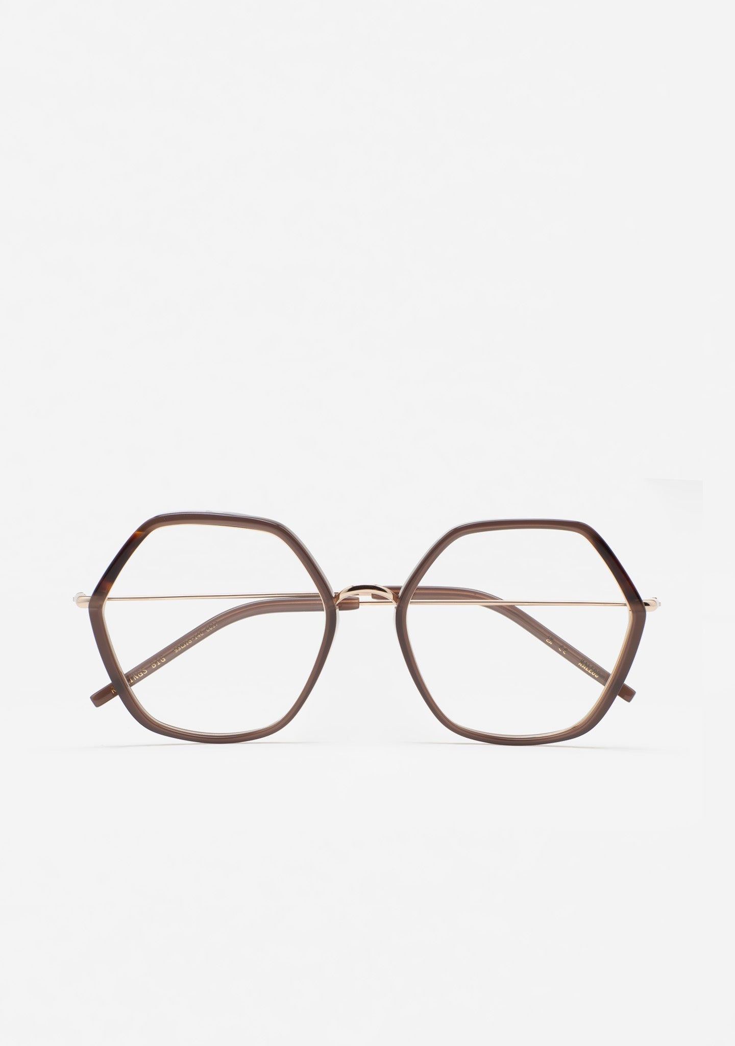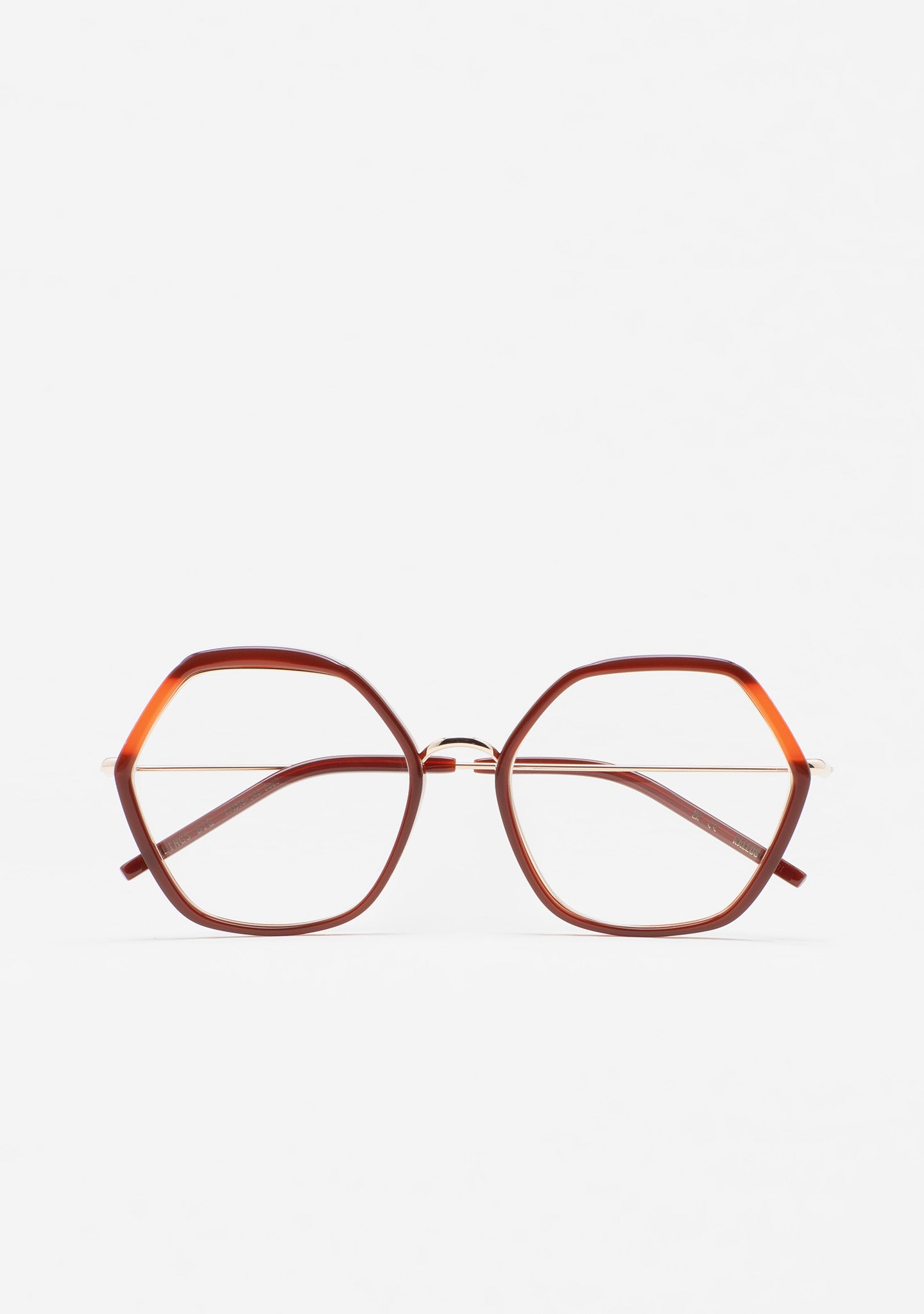 Gafa de ver de forma hexagonal. Frontal de acetato con laminado. Puente de acero inoxidable. Varillas de acero inoxidable con terminal de acetato. Plaquetas de acetato incorporadas. Hecha a mano.