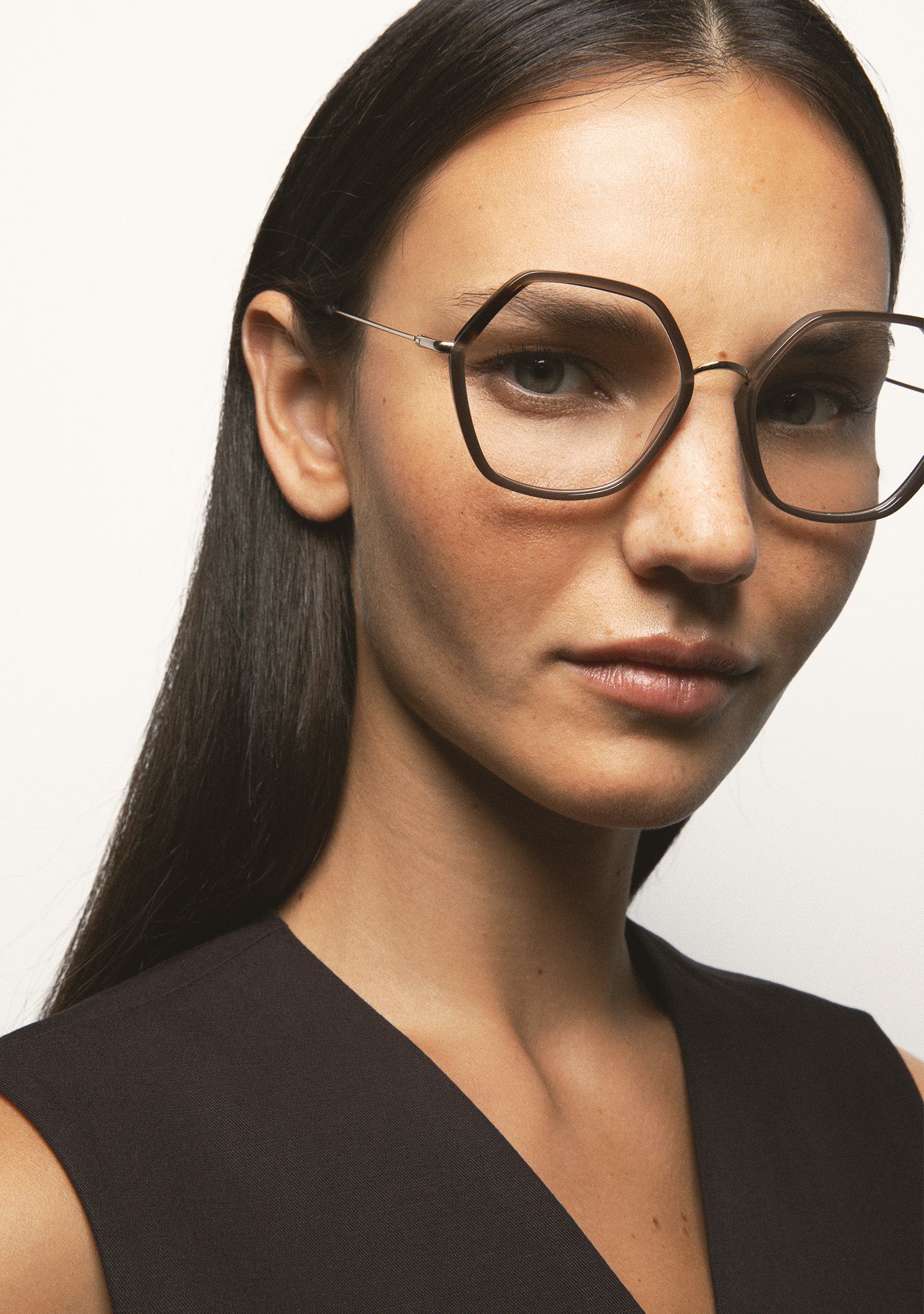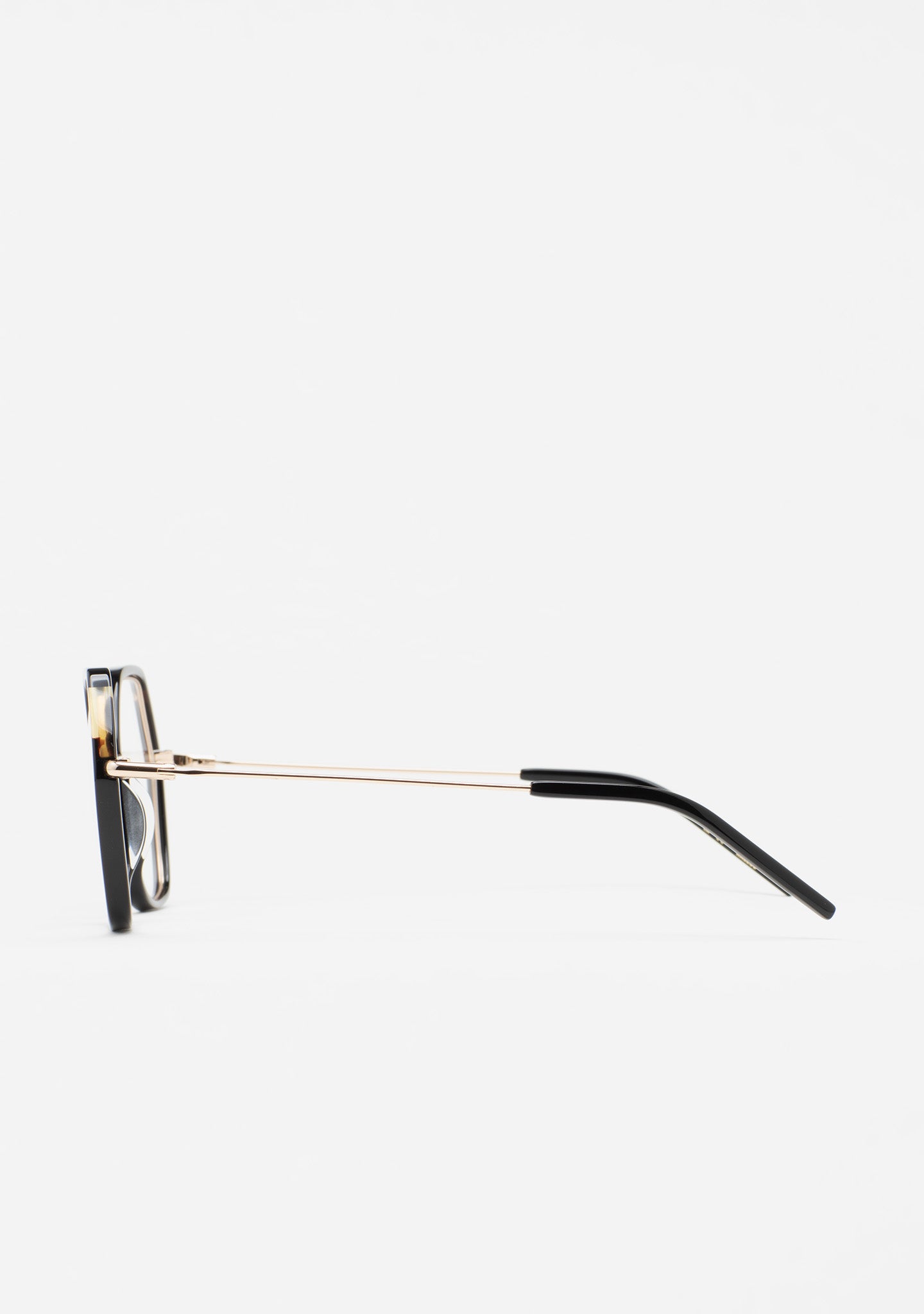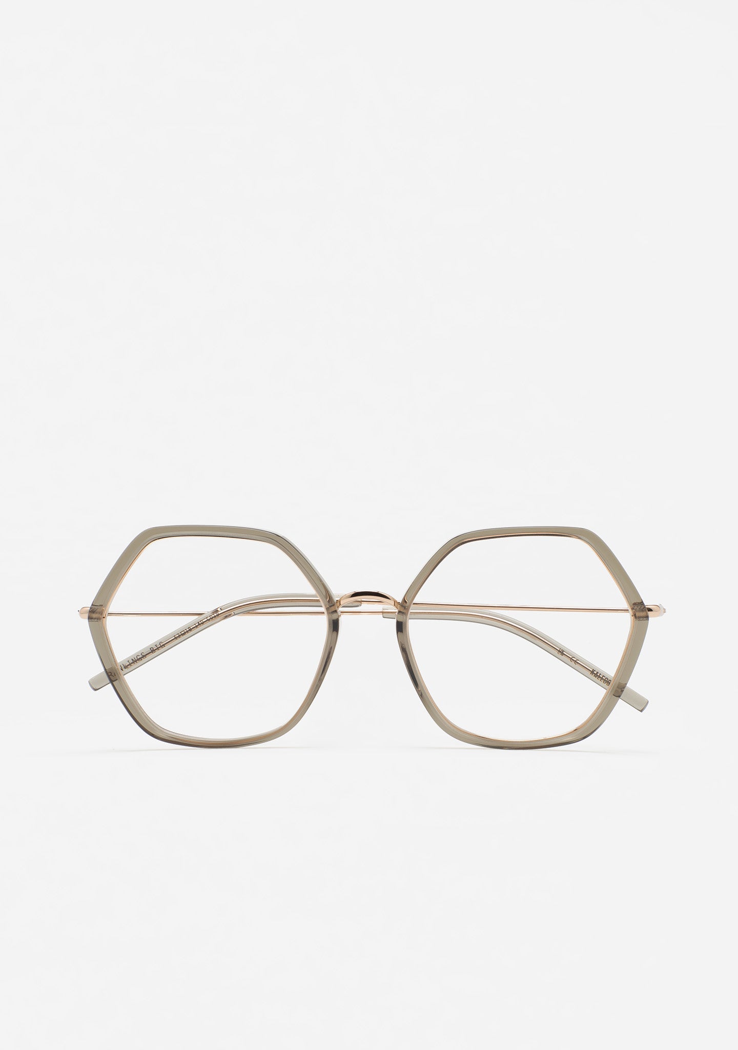 Gafa de ver de forma hexagonal. Frontal de acetato con laminado. Puente de acero inoxidable. Varillas de acero inoxidable con terminal de acetato. Plaquetas de acetato incorporadas. Hecha a mano.