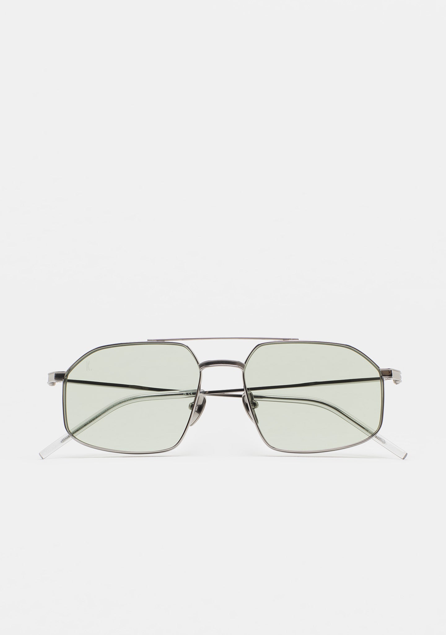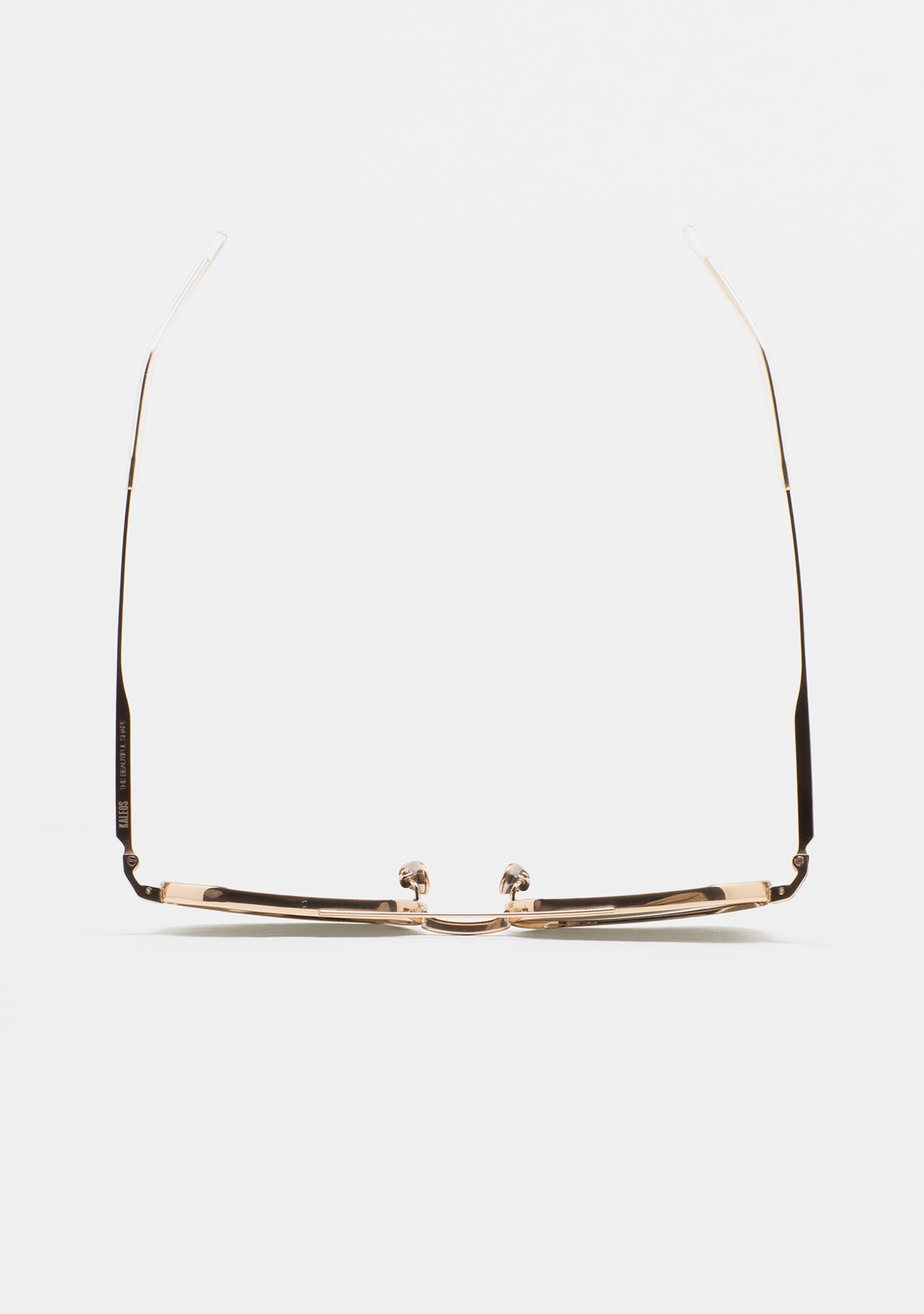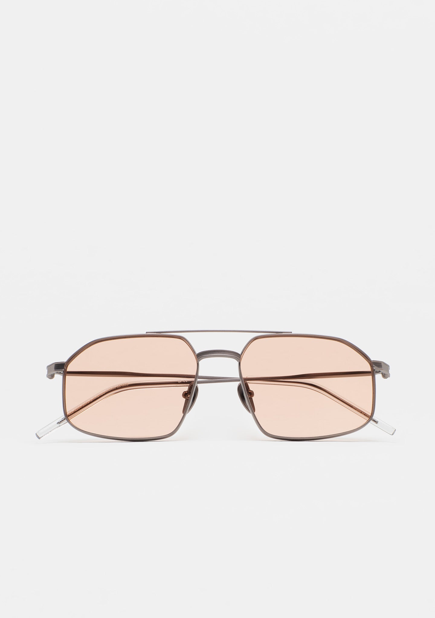 Gafa de sol de forma rectangular con doble puente. Frontal y varillas de titanio. Varillas con terminal de acetato. Lente base 2 con 100% protección UV y tratamiento antirreflejante. Lente categoría 1-3. Plaquetas incorporadas. Hecha a mano.