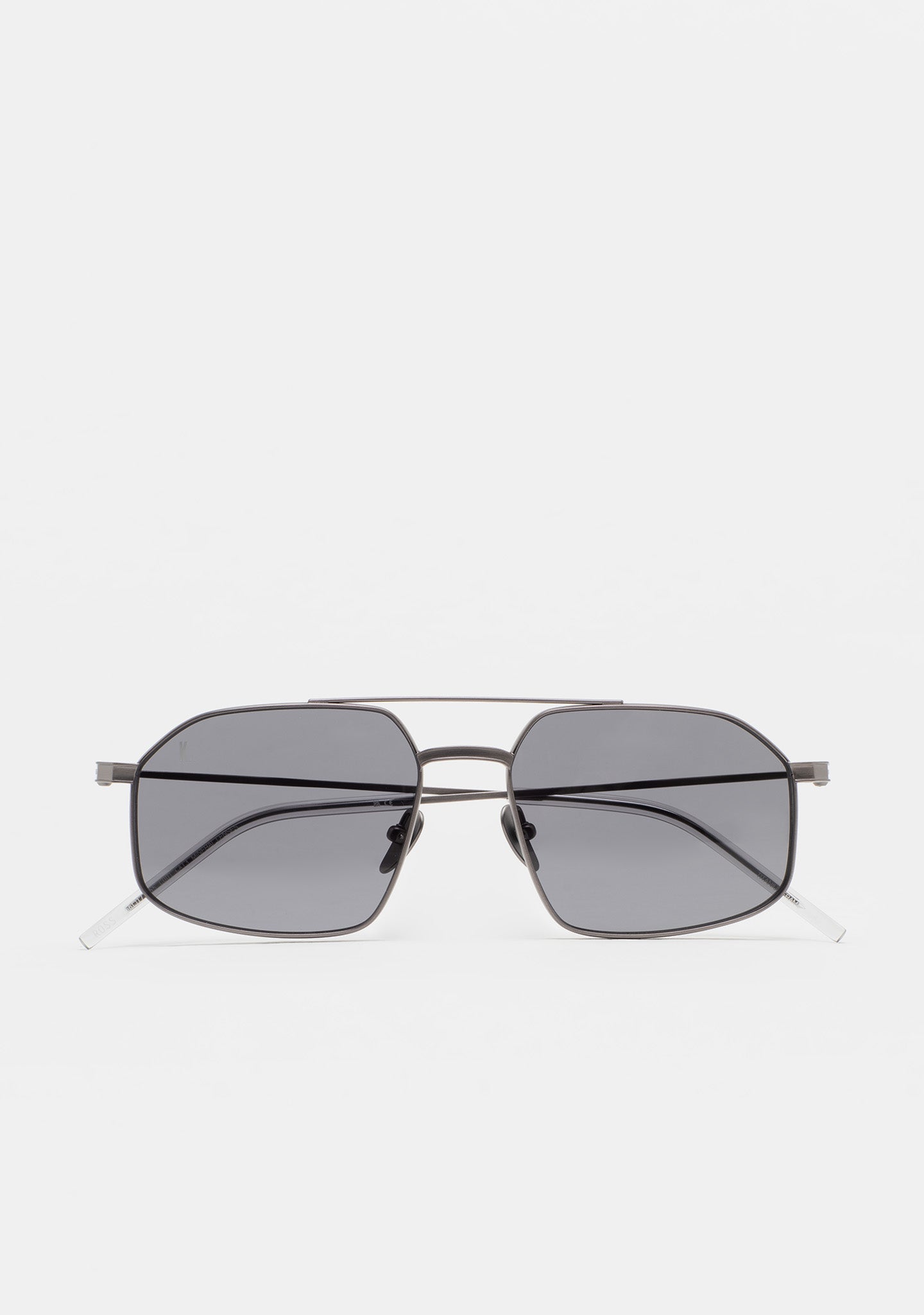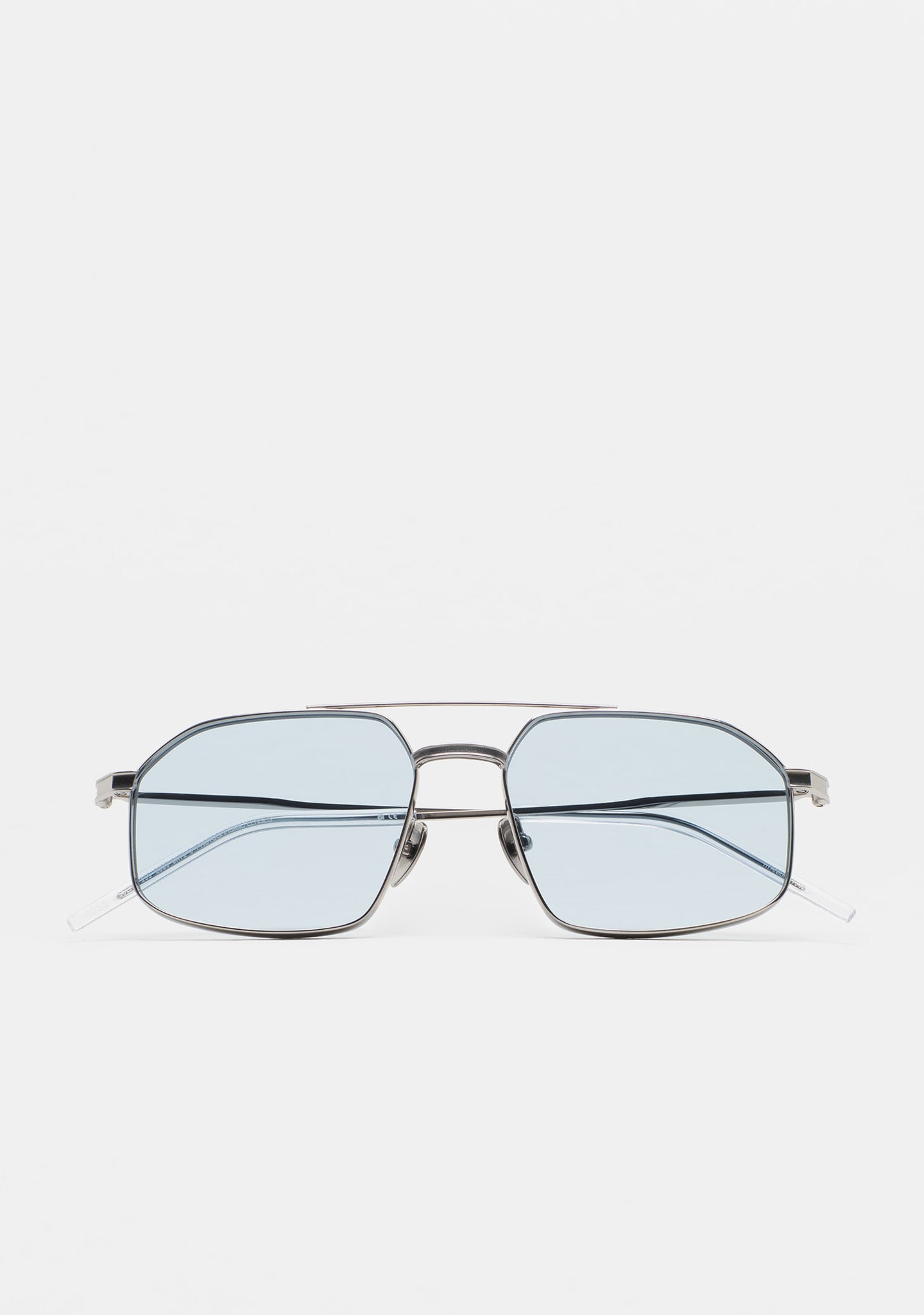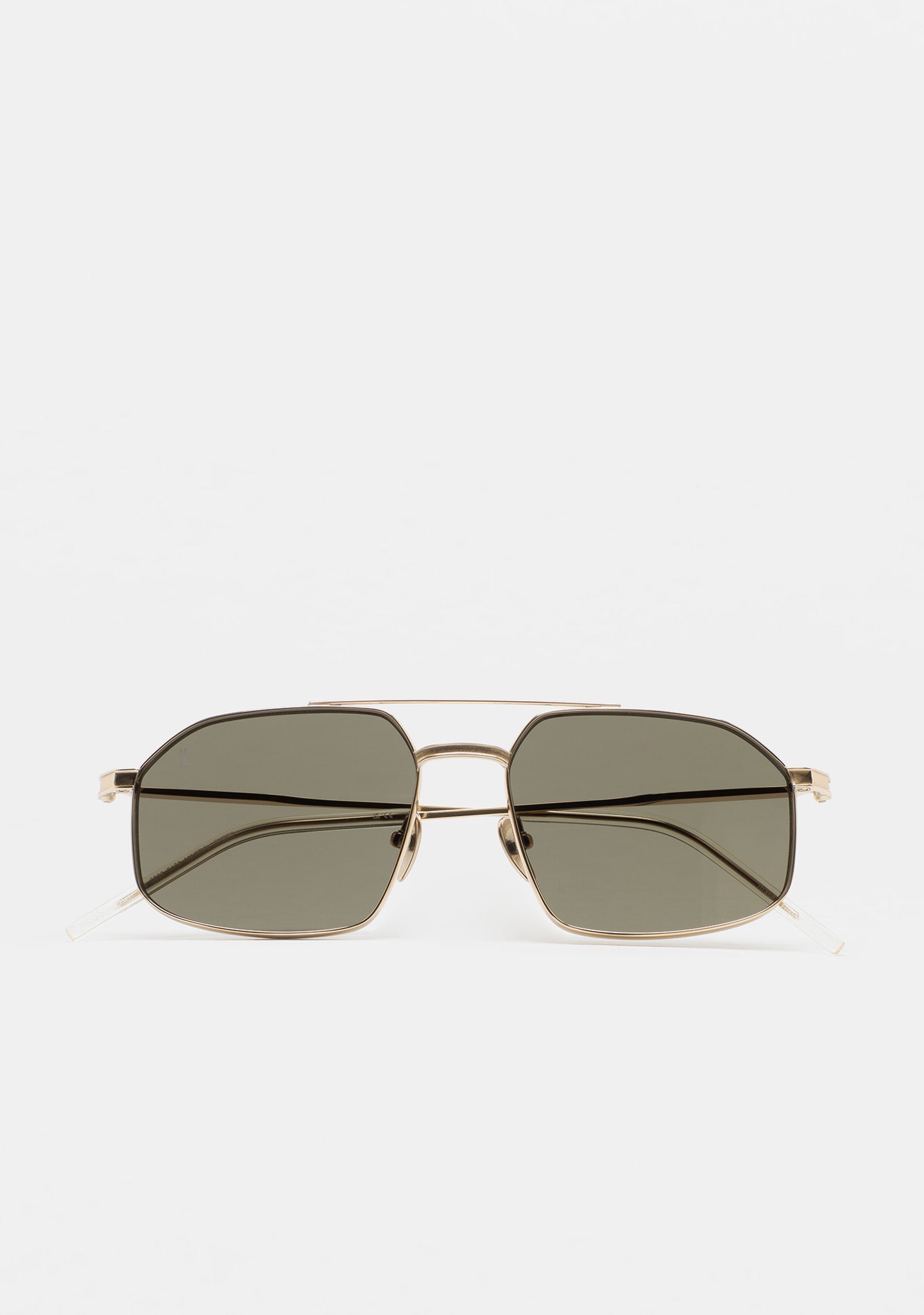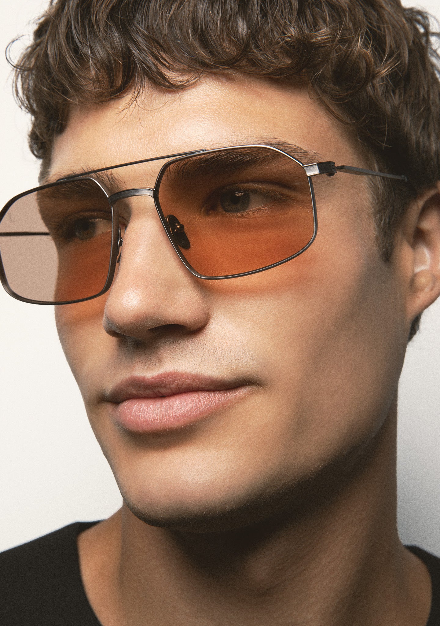 Gafa de sol de forma rectangular con doble puente. Frontal y varillas de titanio. Varillas con terminal de acetato. Lente base 2 con 100% protección UV y tratamiento antirreflejante. Lente categoría 1-3. Plaquetas incorporadas. Hecha a mano.