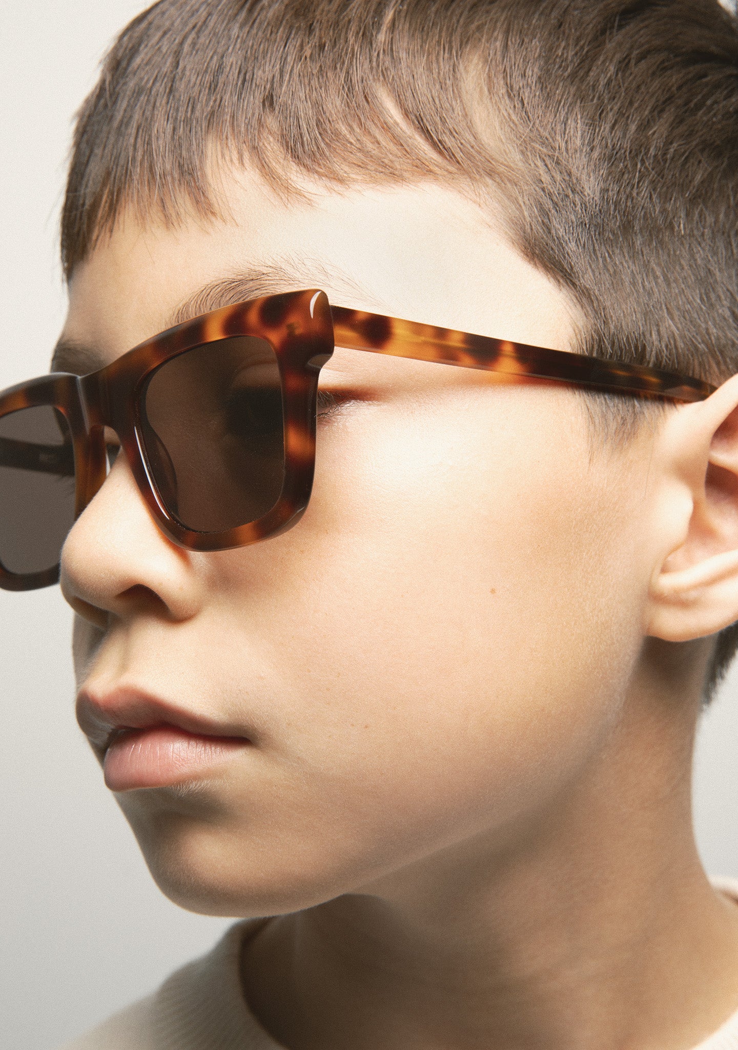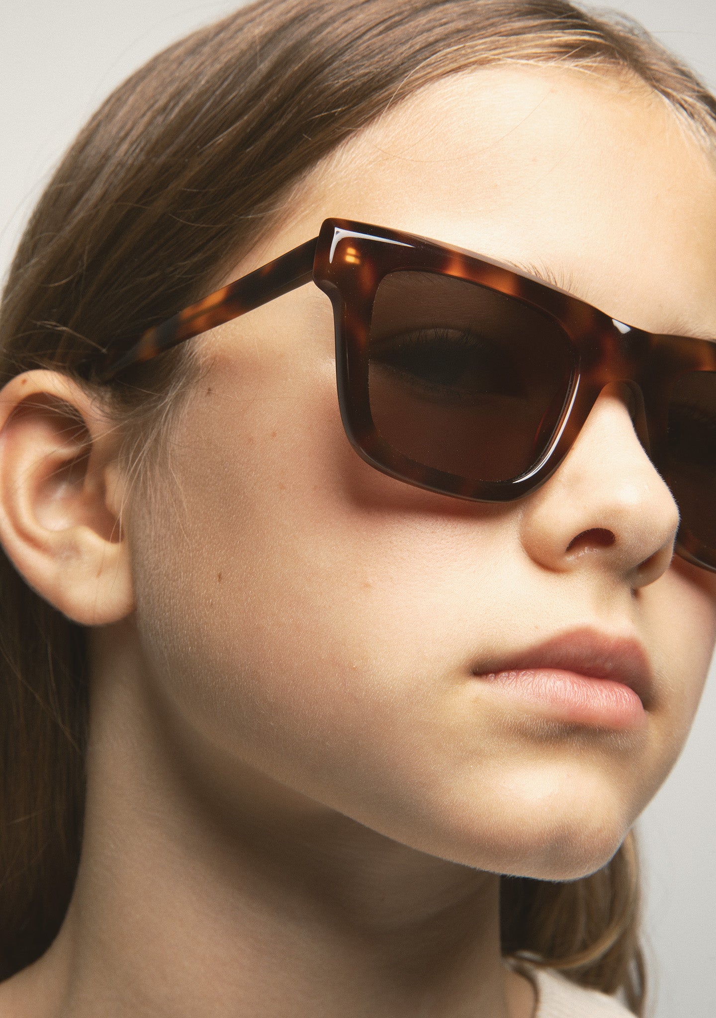 Gafa de sol KIDS de forma cuadrada. Frontal y varillas de acetato. Lente base 2 con 100% protección UV y tratamiento antirreflejante. Lente categoría 3. Plaquetas de acetato incorporadas. Hecha a mano.
