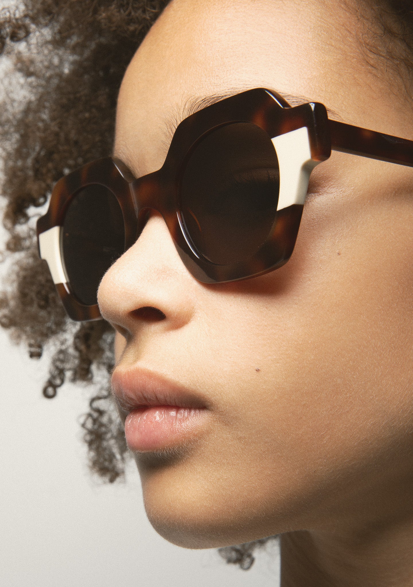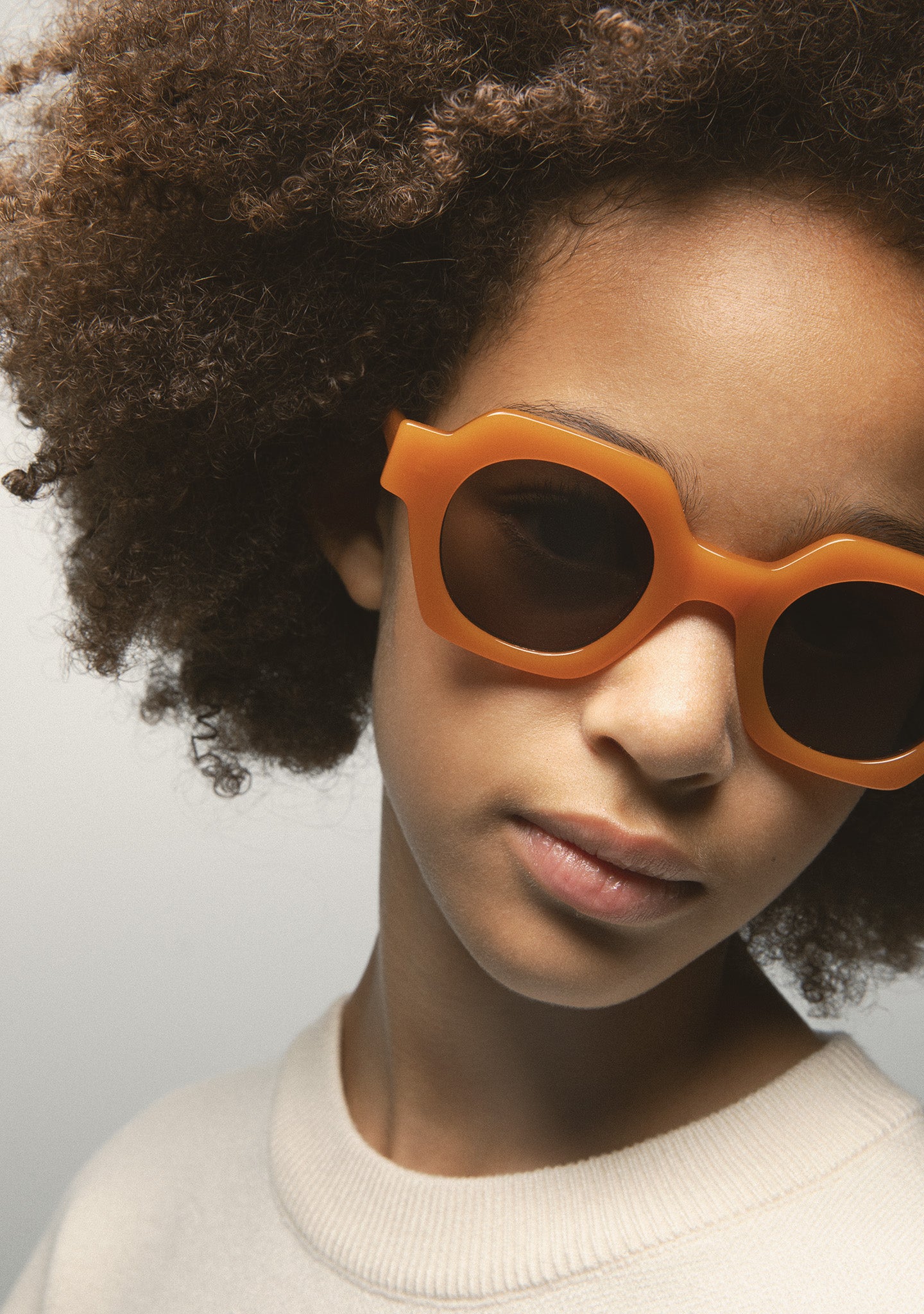 Gafa de sol KIDS de forma hexagonal. Frontal y varillas de acetato. Lente base 2 con 100% protección UV y tratamiento antirreflejante. Lente categoría 3. Plaquetas de acetato incorporadas. Hecha a mano.